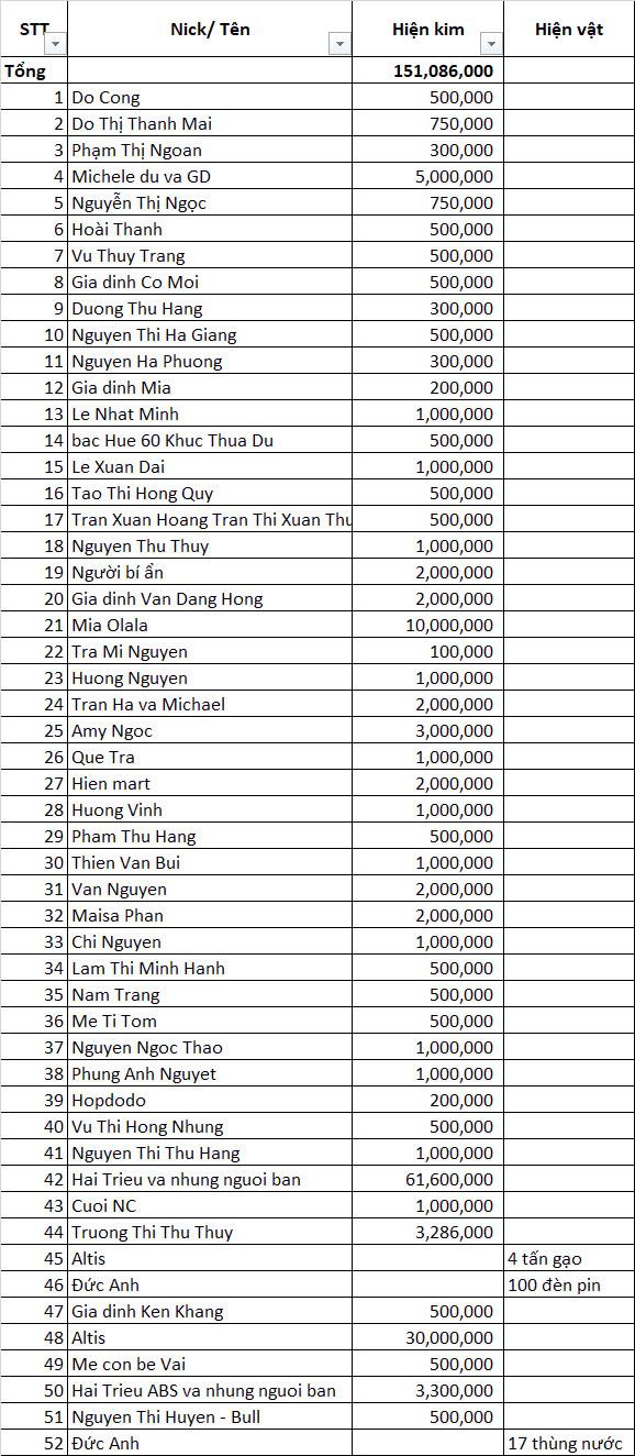 Em xin cập nhật số tiền và hiện vật các mạnh thường quân ủng hộ chương trình ạ: