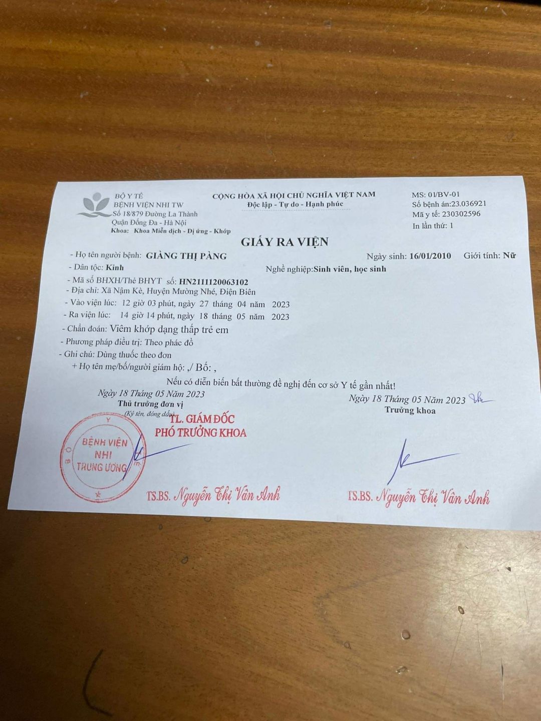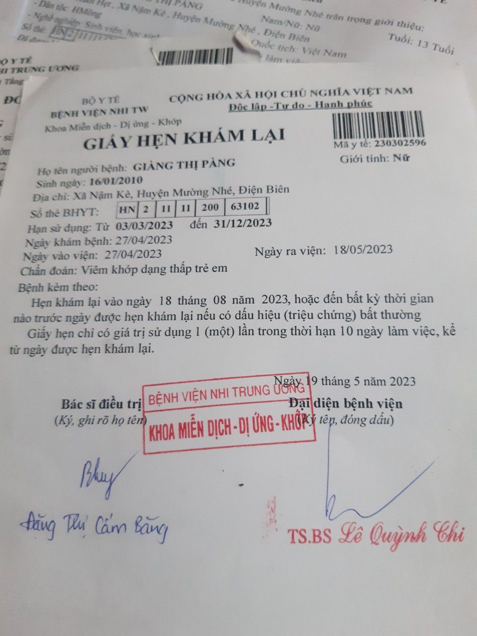 Cháu Pàng theo hẹn đã lên HN khám lại vào ngày 21/12/23 vừa qua. Biết ơn Cô Dương Thu Hương ( Nồi Xôi) đã gieo duyên giúp con. BS Băng Viện Nhi nói tình trạng con đã tốt. Để duy trì được thành quả này. Con cần phải tiếp tục điều trị và theo dõi. Những tháng tới con sẽ điều trị tại TTYT Mường Nhé. Cô Băng cũng giới thiệu BS Súa là người sẽ theo dõi con. Bác Mai tan thay mặt nhóm sẽ là người mua thuốc và gửi lên cho con ạ.