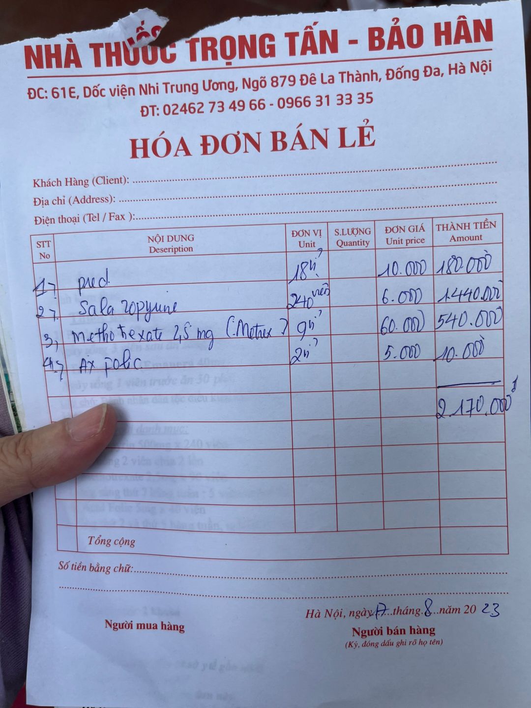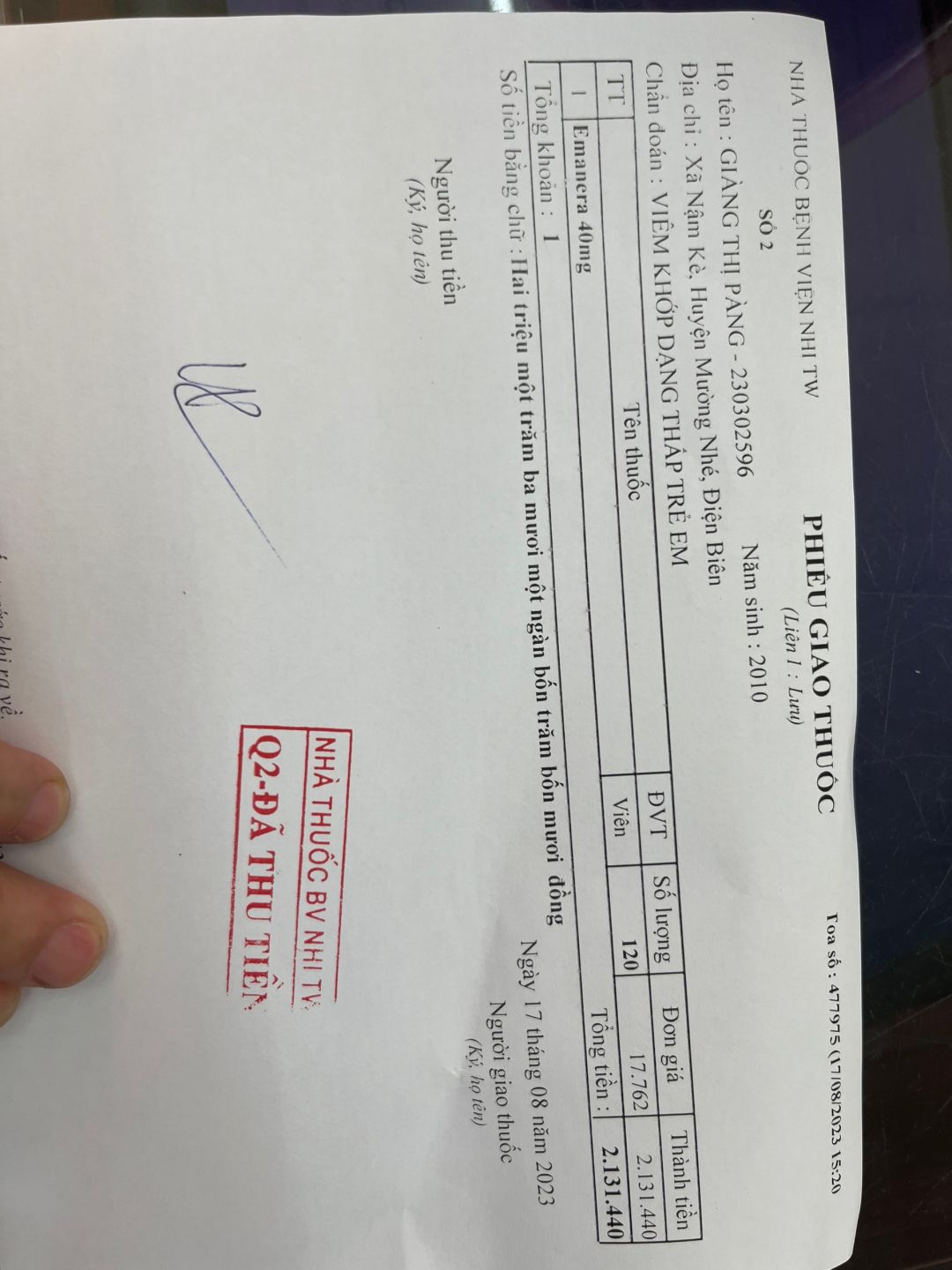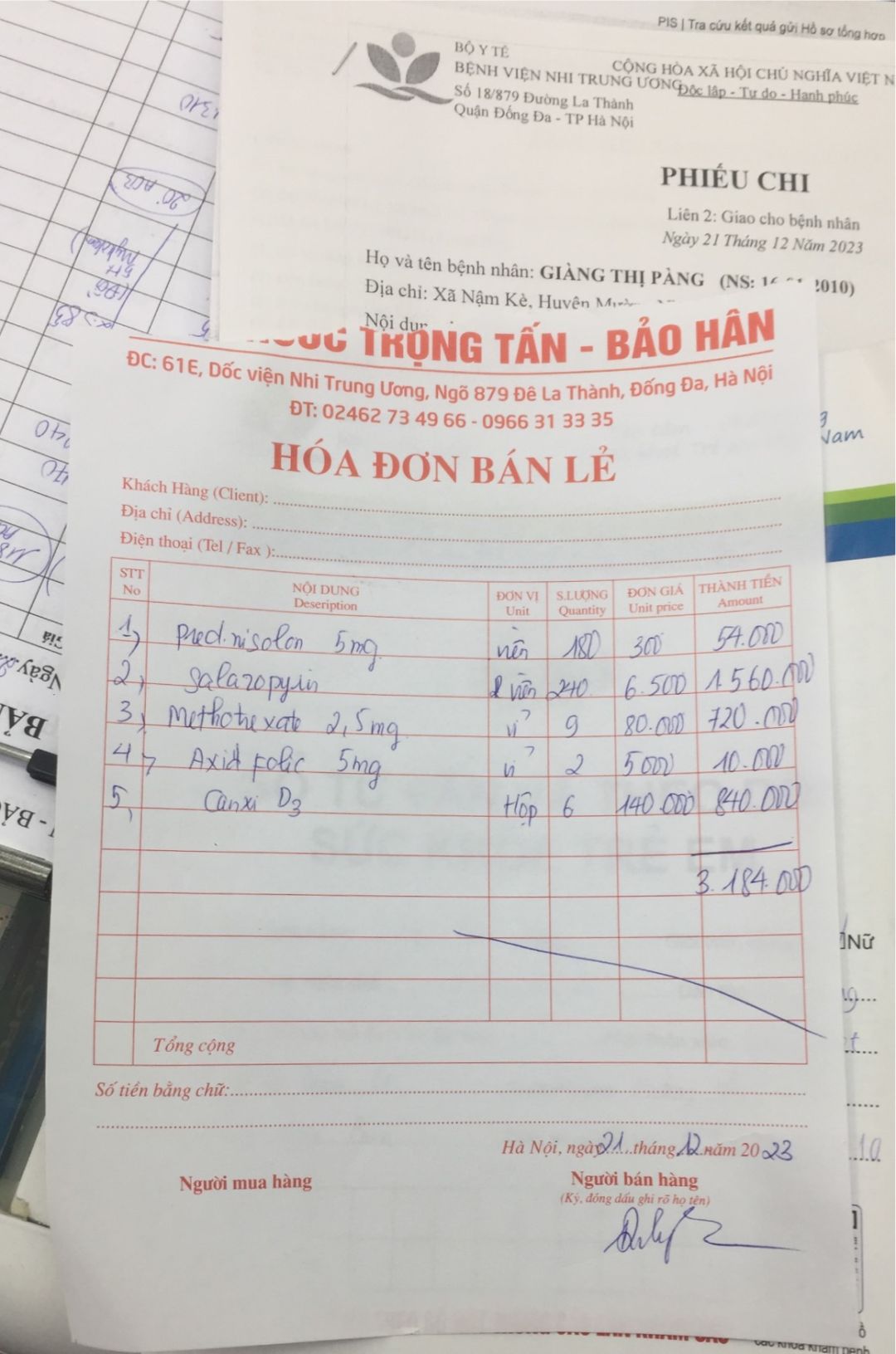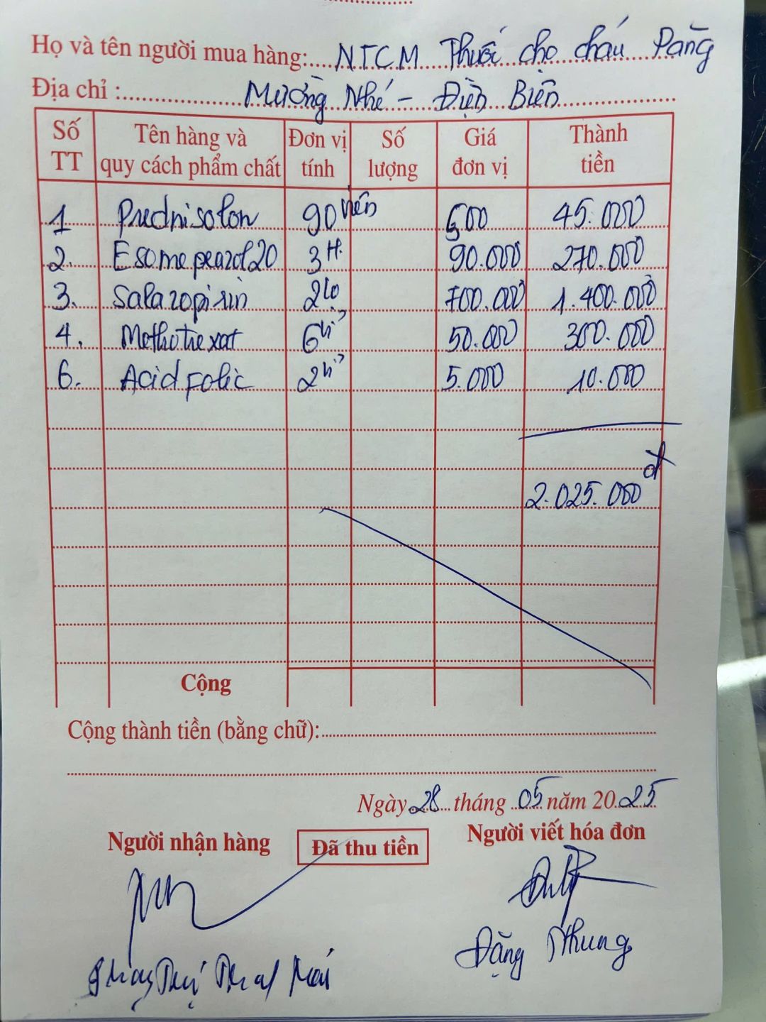 3. Tiền thuốc mua cho con (do không kịp thời gian ra bến xe nên maitan quyết định không xếp hàng chờ nhận thuocs BHBV với cơ số ít và mua từ ngoài: 2.025.000