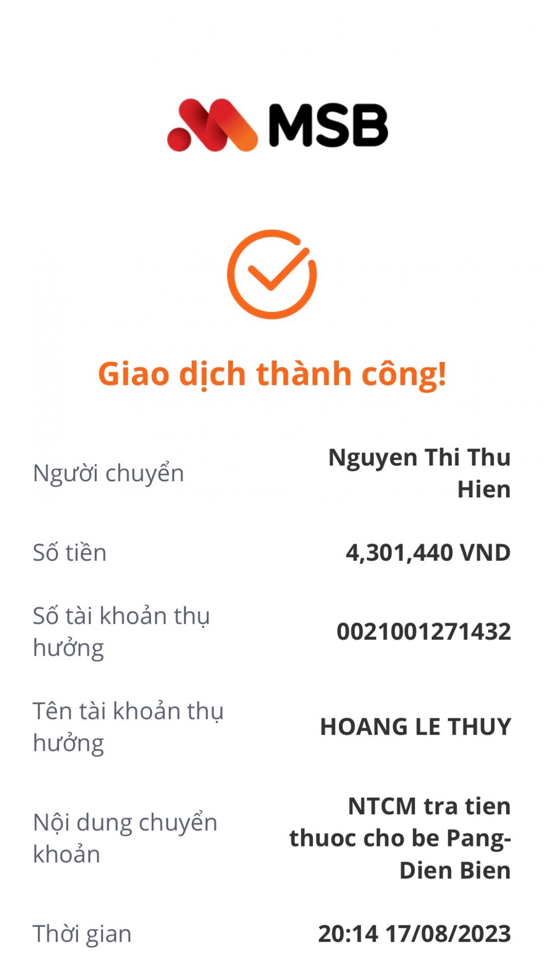 Quỹ đã chuyển 16.288.000đ vào tài khoản chị Hiền Linh. Chị kiểm tra và xác nhận giùm em nhé.