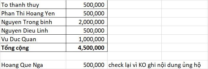 - Ngày 13/12/23: Phan Thị Hoàng Yến: 500.000 đ; Tô Thanh Thủy: 500.000 đ