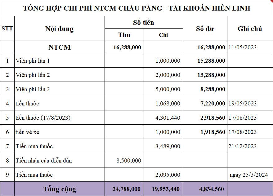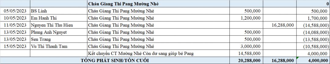 @trangvitgioi : Em chuyển toàn bộ số tiền tồn của chương trình Mường Nhé ( 14,588,000₫ ) và 1,700,000₫ mới được ủng hộ tới Hiền Linh dùm nhé.