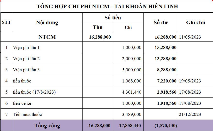1. Các khoản đã chi ( từ tài khoản của Hiền Linh ) đến ngày 31/12/2023 còn thiếu 1.570.440đ