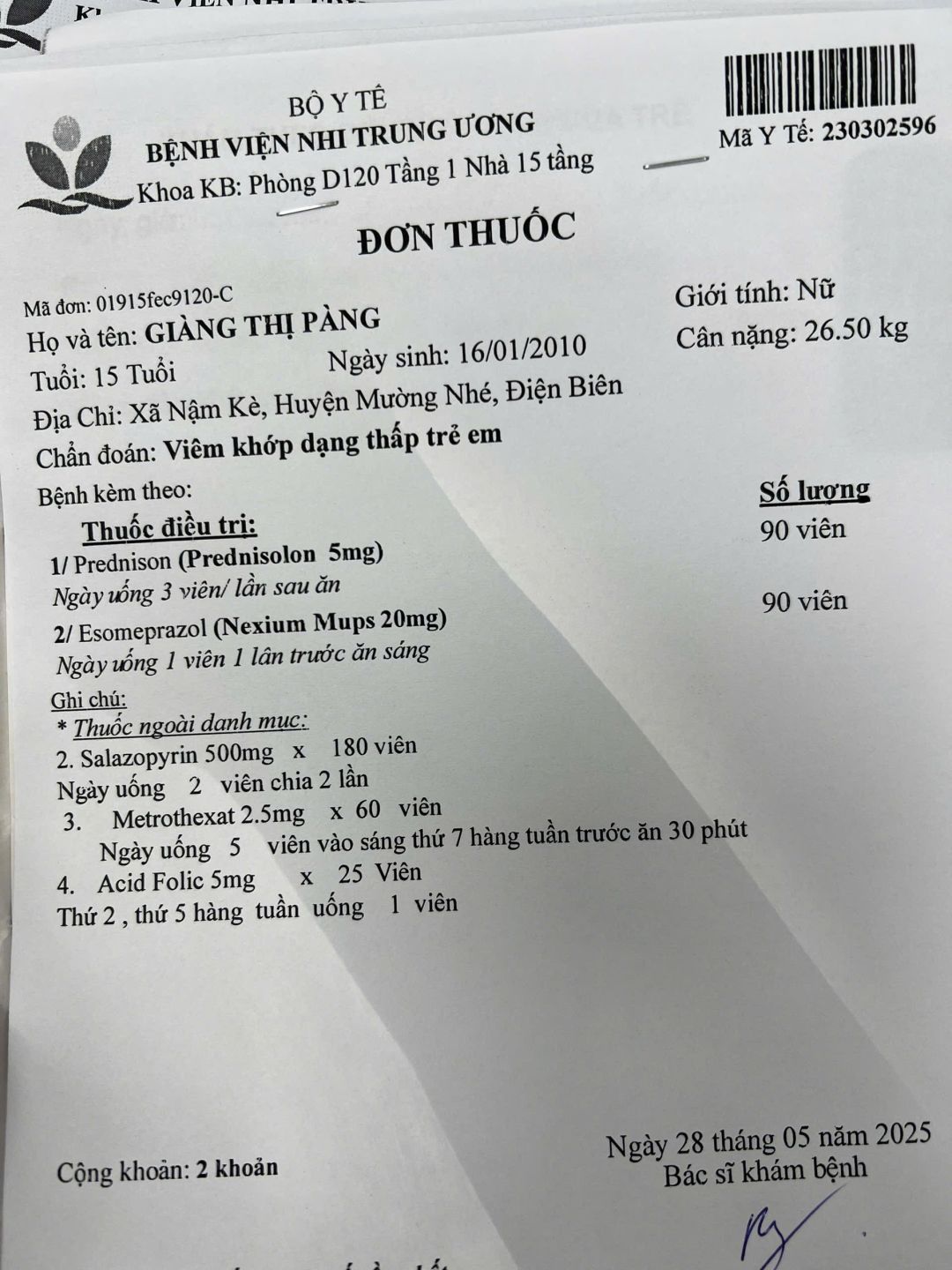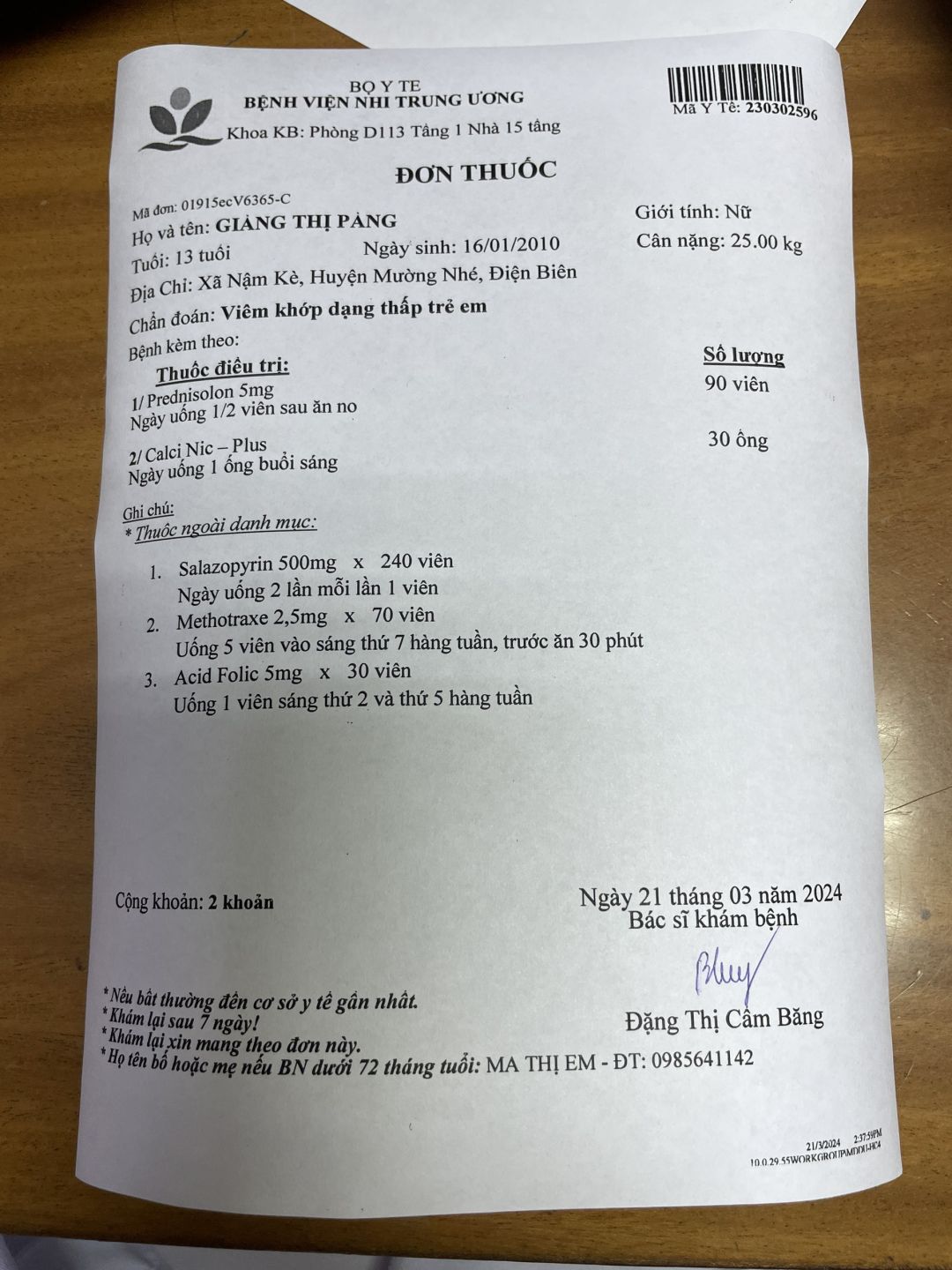 1. Con đến khám tại TTYT Mường Nhé để lĩnh thuốc theo hẹn của BS tại TTYT Mường Nhé