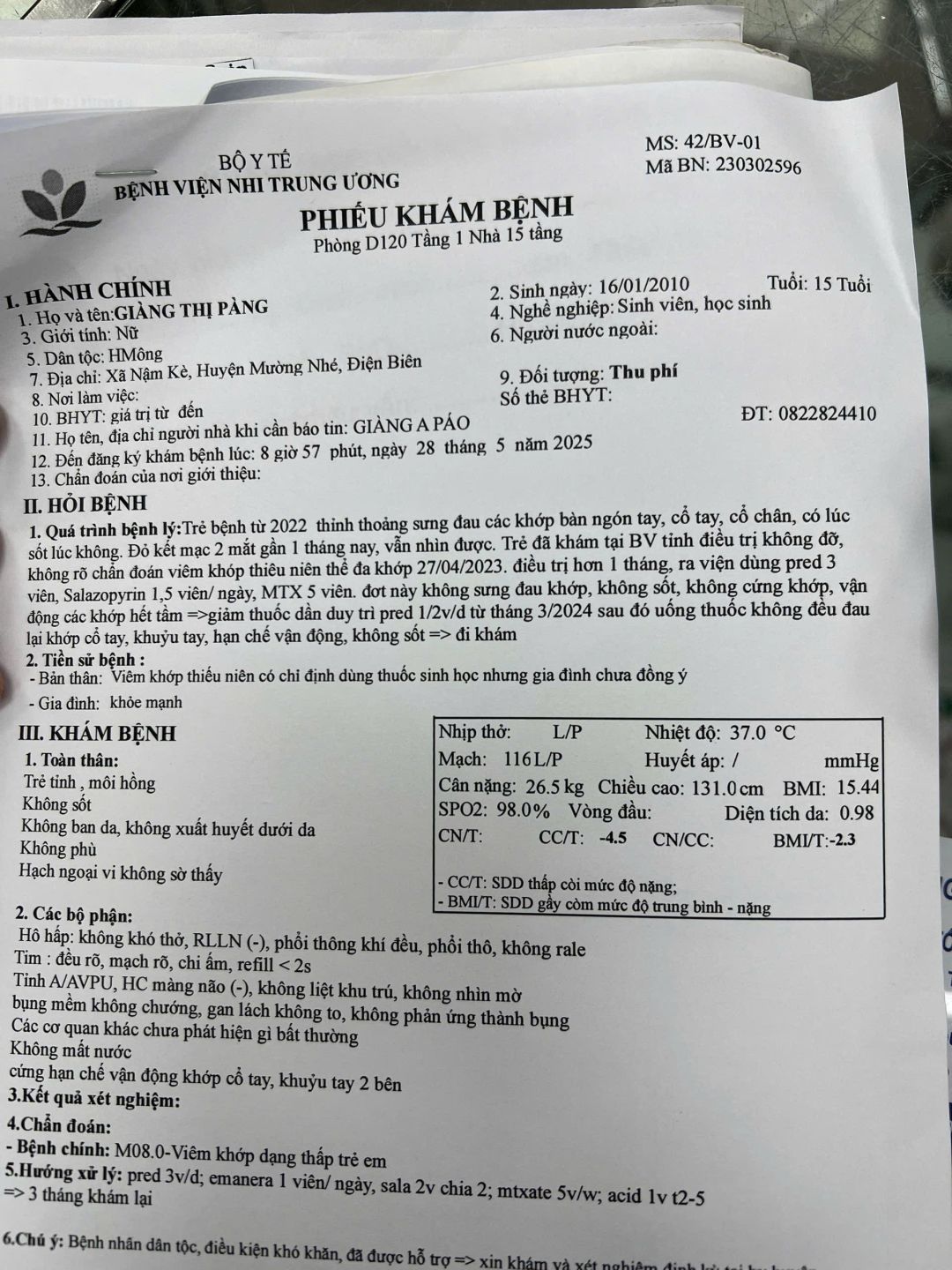 Cũng đã lâu chưa cháu chưa lên HN khám, điện thoại cho thầy Kiên để hỏi thăm mới biết là cháu đã bỏ học mấy tháng nay và bị đau khó khăn trong đi lại. Mai tân đang công tác tại viện Nhi Trung ương nên đã liên hệ để mang cháu khám lại và thống nhất với gia đình: