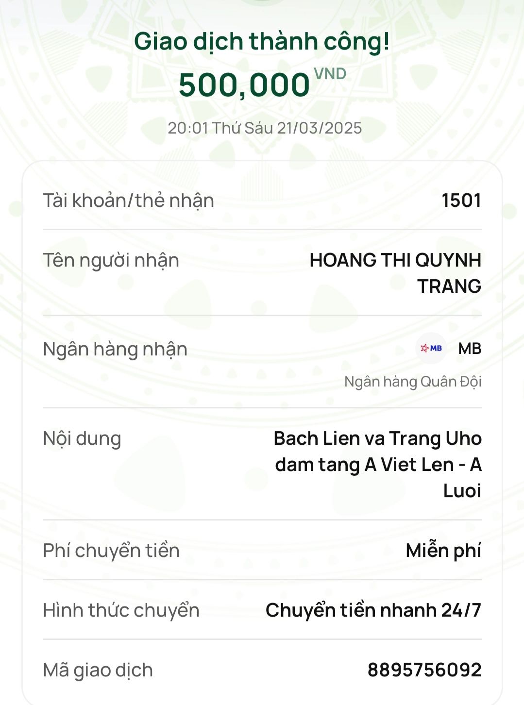 Trang ủng hộ đám tang của anh Lên 300,000₫.
