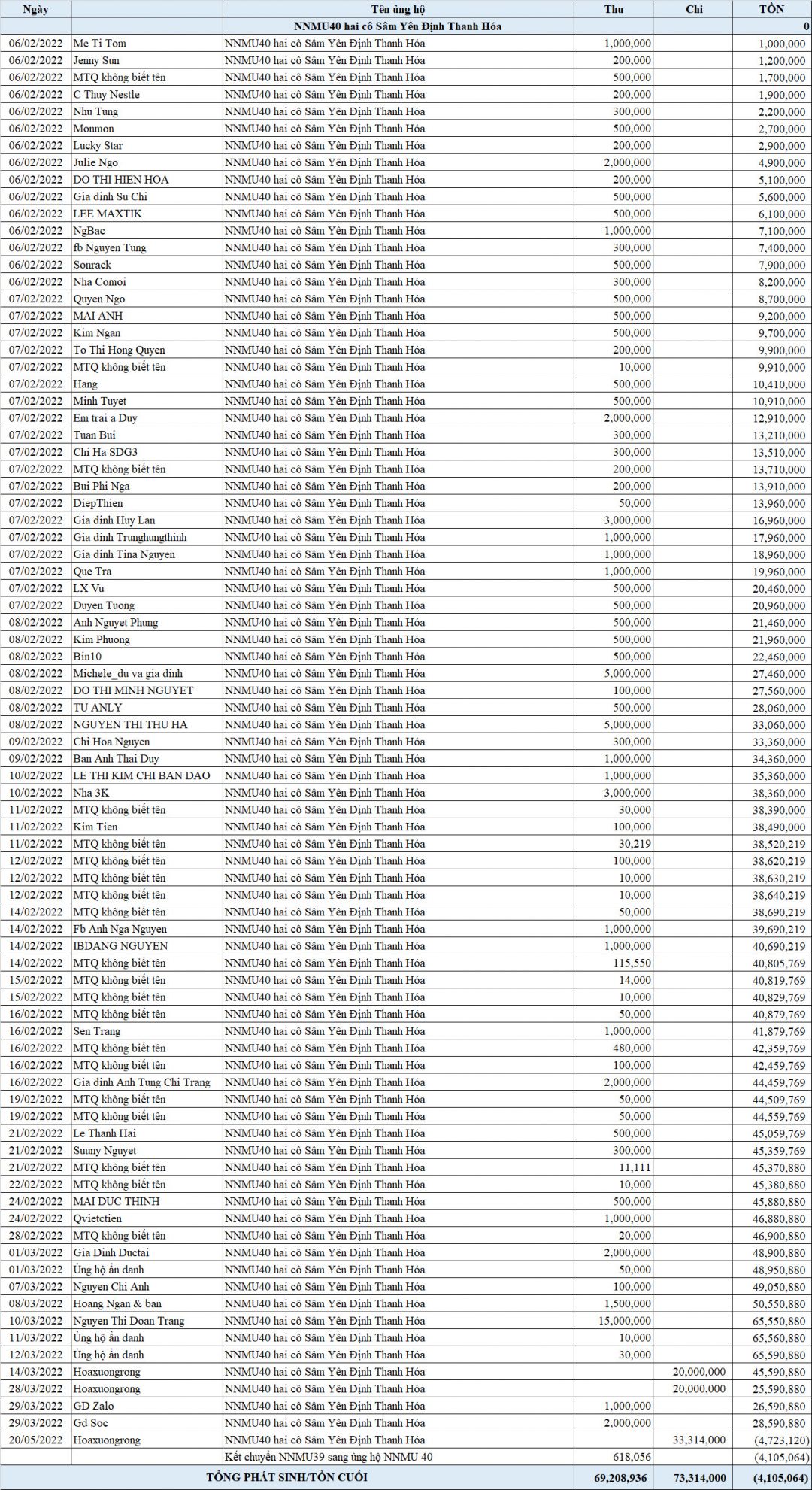 Vịt gửi tổng kết ủng hộ và chuyển tiền NNMU số 40 theo báo cáo quỹ. Phần thiếu 4.105.064 Vịt đề xuất phần dư của NNMU 37 chuyển sang hỗ trợ.