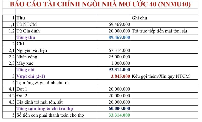 Sau 48h không có thêm khoản ủng hộ nào thêm cho NNMU40, kính đề nghị Tổ điều phối chuyển nốt số tiền công thợ còn thiếu 33,314,000 VND vào tài khoản Hoa Xương Rồng để hoàn thiện việc xây dựng và báo cáo tài chính cho NNMU40 này.