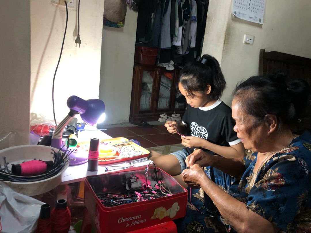 Khi đến thấy 2 bà cháu đang cặm cụi làm hàng gia công. Chị cả đã đỗ vào trường PTTH Kim Bảng 3 và  đang đi học thêm.