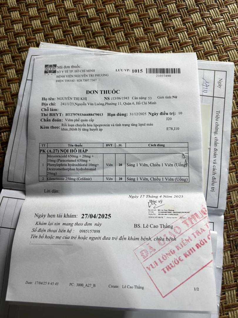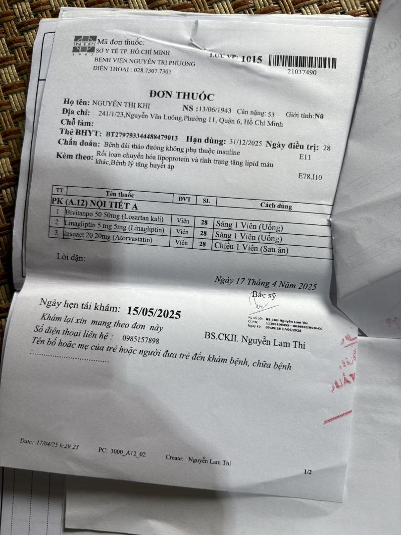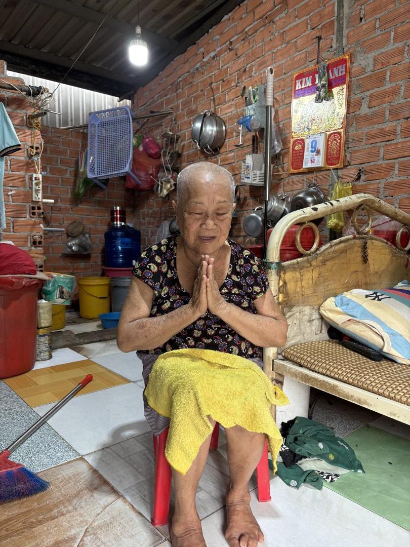 Cụ Nguyễn Thị Khị sinh năm 1943, năm nay 82 tuổi, cụ không đi được phải lết với chiếc ghế nhựa nhỏ, cụ mang nhiều bệnh trong người, hàng tháng đi khám ở bv Nguyễn Tri Phương, có BHYT. Cũng may là có cô Xuân- bạn của em gái cụ- hàng tháng đến đưa cụ đi khám, lấy thuốc và chở cụ về.