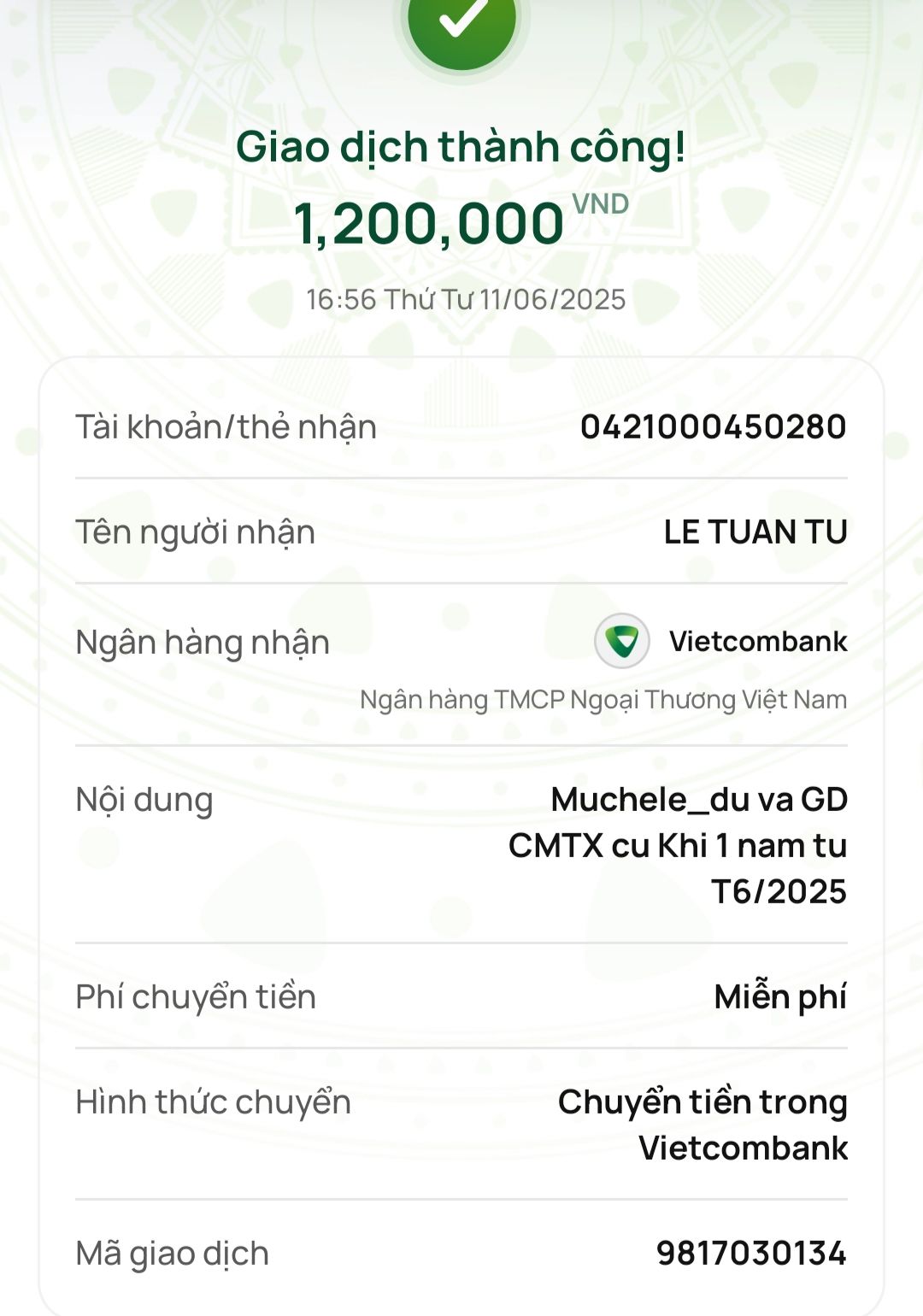 Bạch Liên và chị Trang đã chuyển tiền CMTX Cụ Khị 6 tháng kể từ tháng 12/2025  tới @letuantu .
