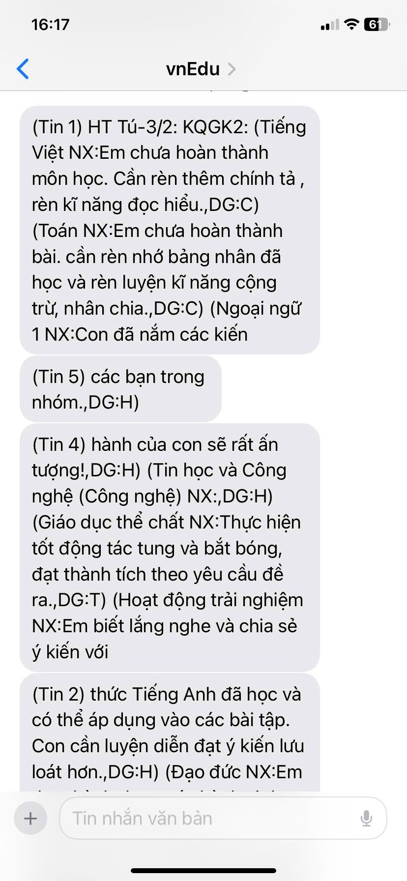 Gửi cả nhà kết quả học tập gửi qua tin nhắn phụ huynh.