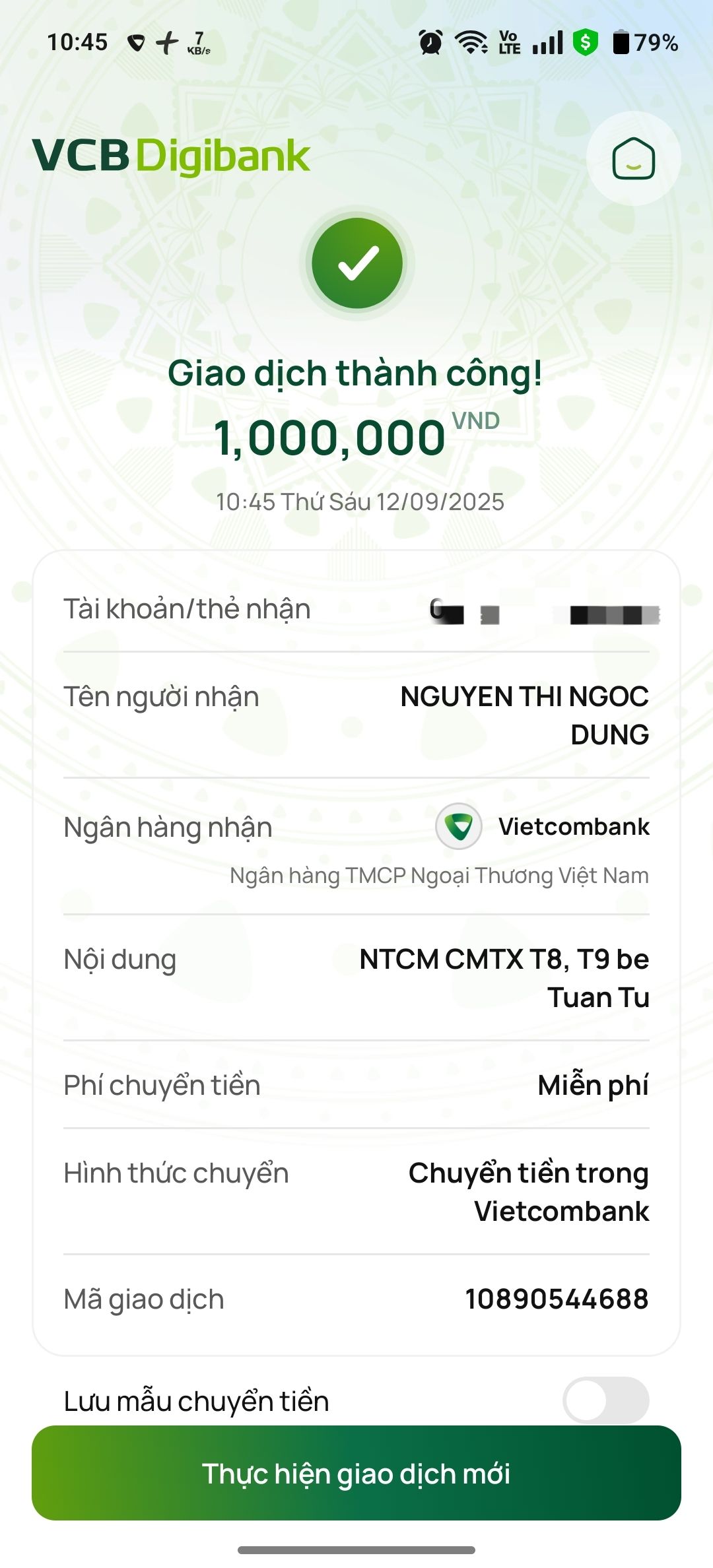 Do chị Dung bận đi làm, ít có thời gian ghé quán để nhận tiền, letuantu đã chuyển 500,000đ/tháng tiền CMTX T8 và T9 cho bé Tú.
