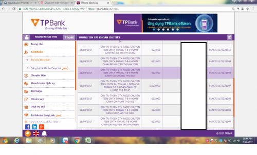 Quỹ Từ thiện Pacie đã chuyển tiền CMTX tháng 7,8,9 vào TK của Lệ Tear. Như Vậy Quỹ Từ thiện Pacie đã chuyển vào TK của Lệ Tear 1200k ngày 14/06/2017 và 600k ngày 11/08/2017. nhờ Lệ Tear kiểm tra và chuyển tới gia đình em Hiếu giúp.