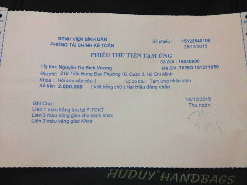 Thứ 5 tuần rồi, letuantu và loannguyen có đến đóng tạm ứng để các bác sĩ chụp CT và làm các xét nghiệm liên quan. Bên chùa nơi trước đây Vương ở có hỗ trợ 1 triệu đồng, bobbie và các bạn kêu gọi được 300k, Vương có một ít tiền do các cô chú nằm gần hỗ trợ, chú 6x đề xuất ứng trước 500k để kịp đủ đóng viện phí. Chi phí tạm ứng là 2 triệu đồng.