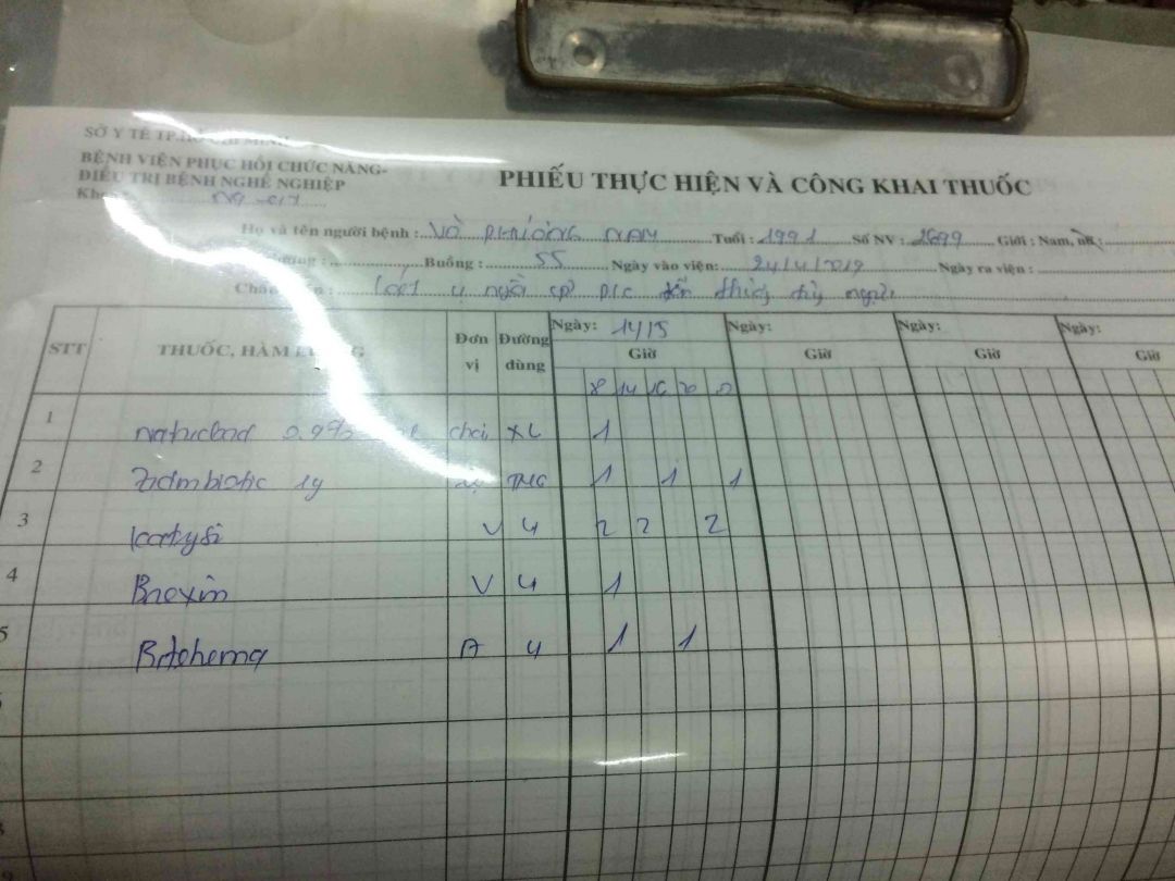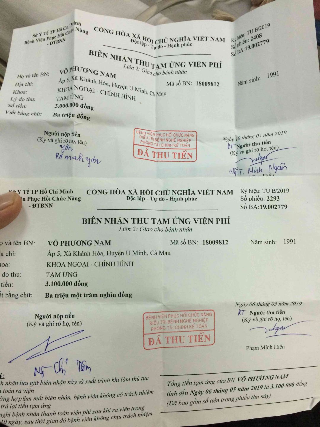 Trường hợp của em Võ Phương Nam Mai Trâm xem thấy hai tấm giấy đóng cảm ứng tiền của Nam. là ngày 3/tháng/5/2019.bệnh viện gửi giấy thông báo đóng 5.triệu đồng.