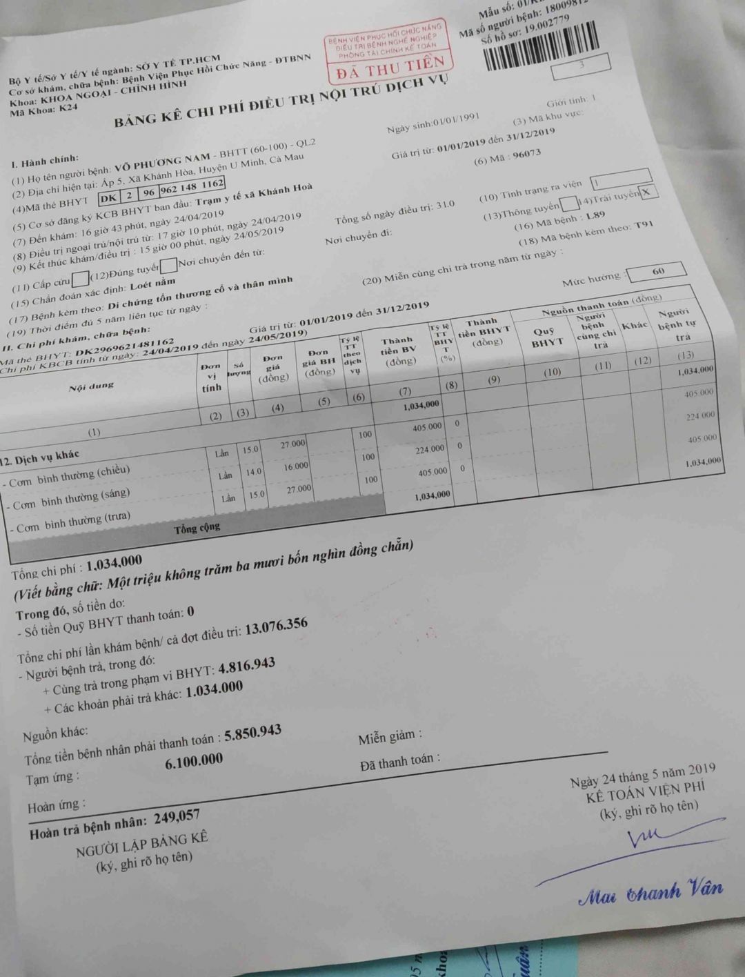 ngày10/tháng/5/2019 Em đóng 3triệu tiếp theo. tổng cộng Nam đã đóng cho bệnh viện 6triệu một trăm ngàn.như vậy là đang còn lại bệnh viện 1.900.000đ