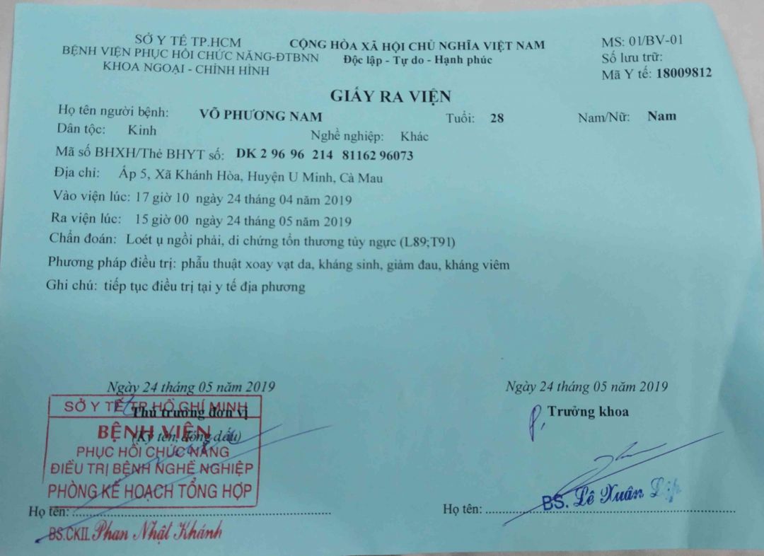 Cho đến khoảng thời gian gần đây vì ngồi nhiều quá + biến chứng Nam bị loét ở vùng mông và phải đi bệnh viện, 2 lần trước đi bệnh viện mổ và điều trị, Nam được một sư thầy ở đạo tràng Van Viện giúp trả tiền viện phí, tiền ăn uống và điều trị tại bệnh viện. Lần này vết loét của Nam bị tái phát Nam được người nhà đưa lên SG vào ngày 25 tháng 3 năm 2019, để điều trị vết loét, Nam được các bác sĩ mổ cách đây 2 tuần.
