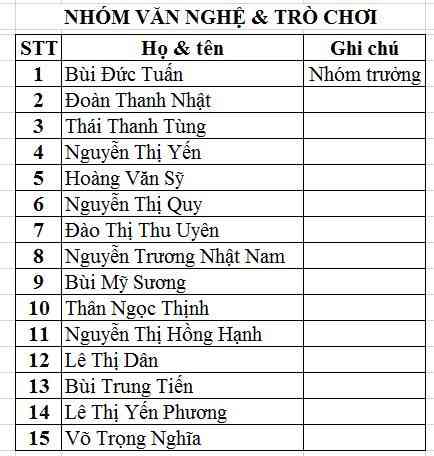 [li]Nhóm hậu cần: Trang trí sân khấu, dọn dẹp vệ sinh xung quanh, phân chia quà bánh.[/li]