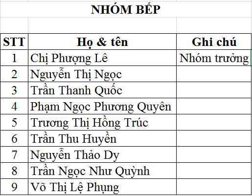 [li]Nhóm bếp: Chuẩn bị cho buổi ăn trưa và chiều.[/li]