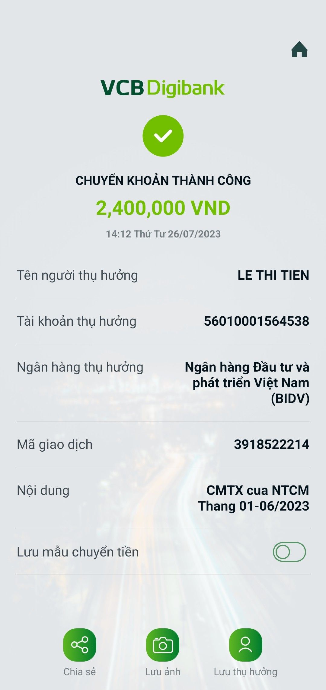 Hôm nay, ngày 26/7/2023. Em đã thay mặt MTQ chuyển khoản CMTX cho cháu từ tháng 01/2023 đến tháng 6/2023 (06 tháng) với số tiền 2.400.000đ (400.000đ/ 1 tháng) vào tài khoản của cháu. Từ nay mỗi tháng e sẽ chuyển khoản CMTX cho cháu đầy đủ vào cuối tháng. Em đã nhận được CMTX tháng 7/2023 từ a PHAM TRƯỜNG SƠN _ Viethuong ạ.