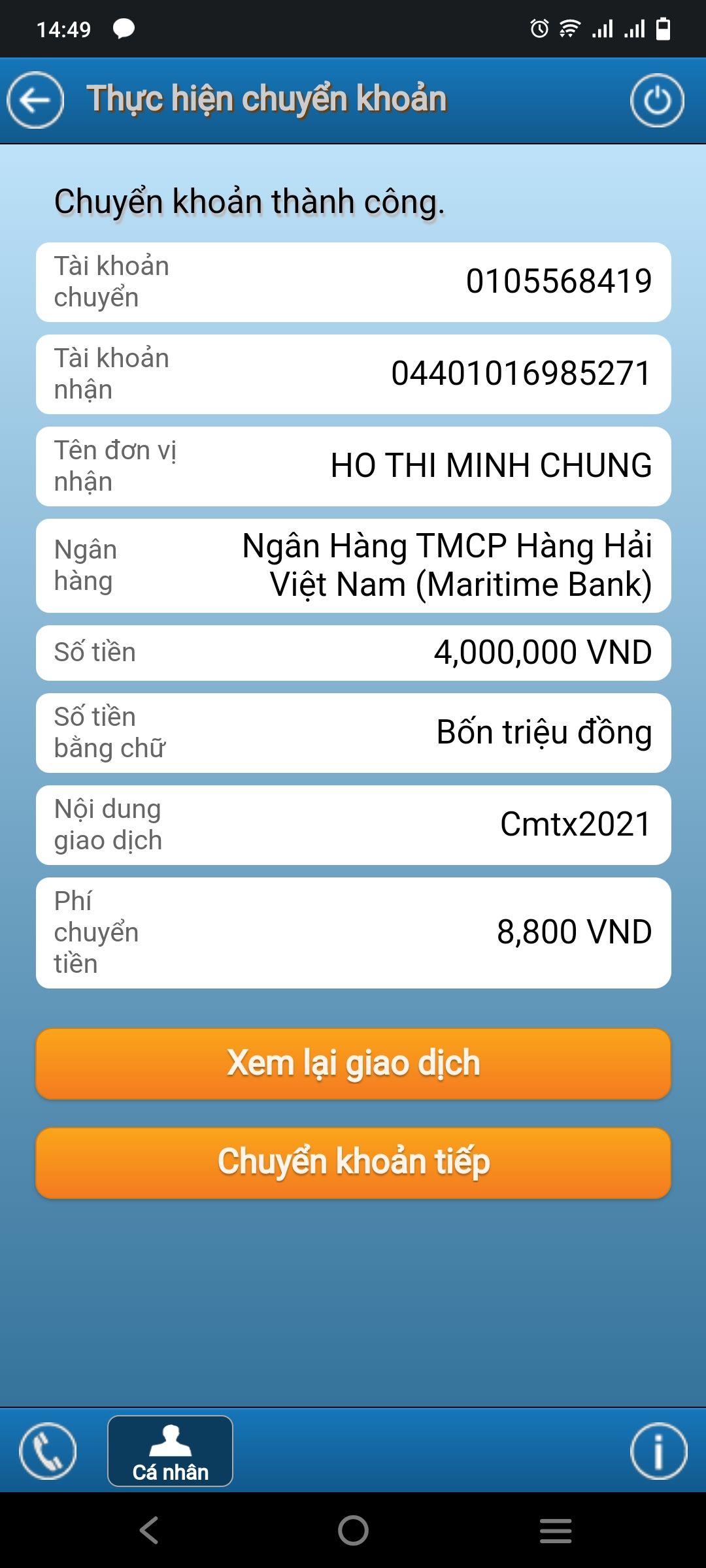 Như vậy, đến hiện nay em đã hoàn thành chuyển CMTX từ MTQ cho cháu đến tháng 12/2022. Nhờ vào số tiền CMTX mà cháu có thể trang trải thêm cho cuộc sống.