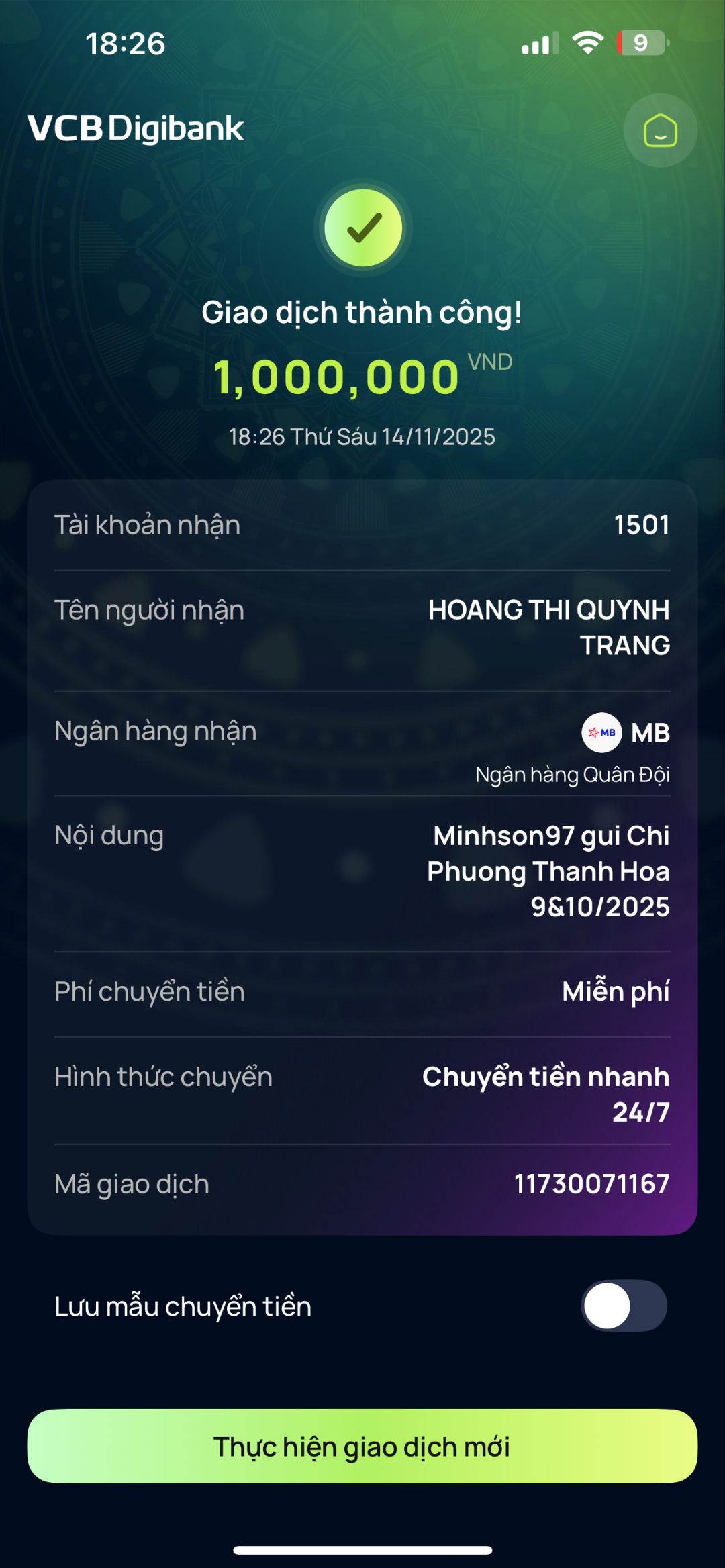 @trangvitgioi : Em chuyển tới cháu @Phuongle 1,000,000₫ tiền CMKTX từ @minhsơn97 dùm nhé.