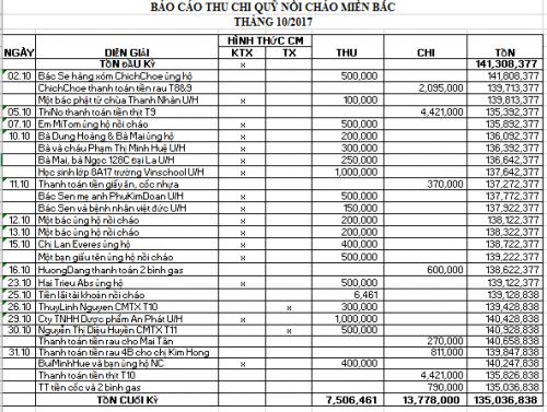 Tep gửi cả nhà báo cáo thu chi nồi cháo T11.2017 như chi tiết bên dưới nhé