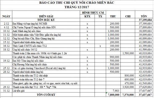 Tep gửi cả nhà báo cáo thu chi nồi cháo tháng cuối cùng của năm 2017 như bên dưới nhé