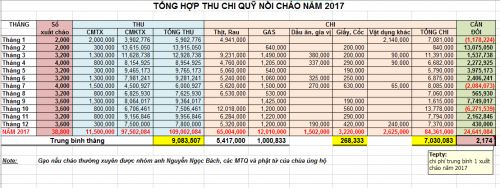 Năm 2017, thu thường xuyên của nồi cháo giảm chỉ con 1.3 tr/tháng, tuy nhiên khoản thu không thường xuyên khá ổn định giúp cho thu bù được chi và tổng cân đối năm quỹ cháo dư hơn 24 triệu đồng. Trong báo cáo này Tep có tính mức thu chi trung bình hàng tháng : tổng thu, tổng chi, thêm chi tiết cho khoản chi của tiền rau, thịt, gas và cốc giấy....