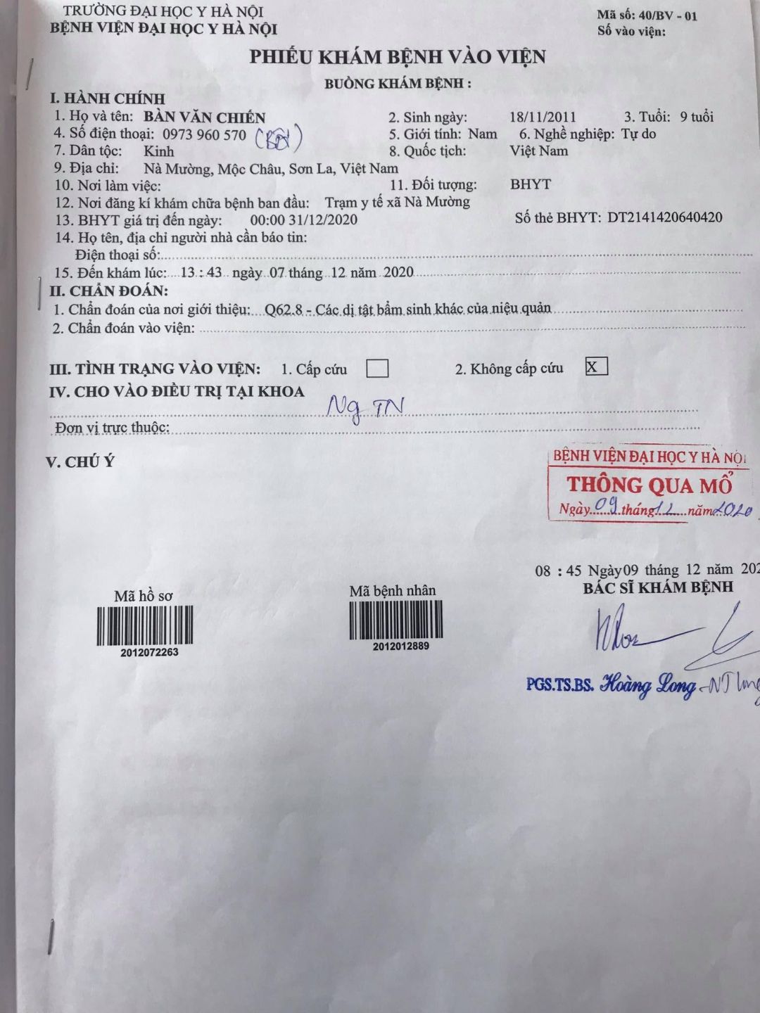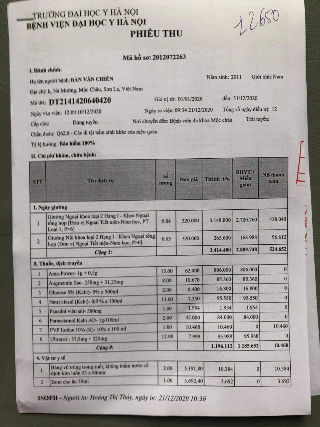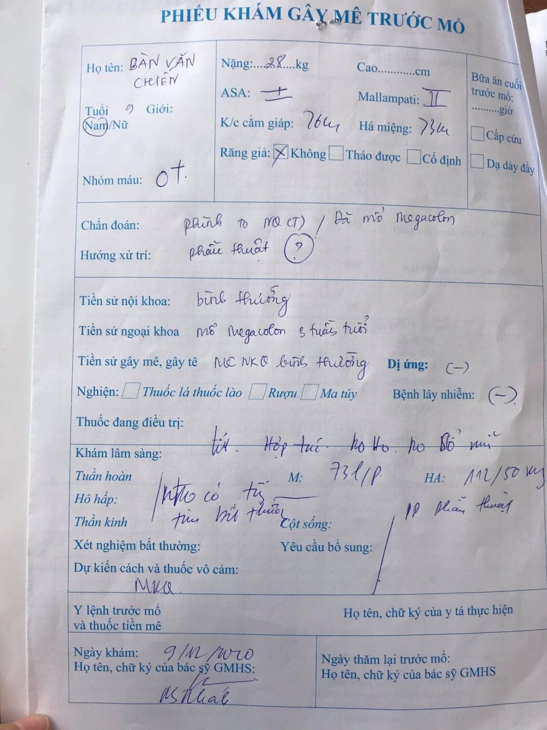 Được Chẩn đoán: Phình to NQ (T)/đã mổ Megacolon đã mổ tại Bệnh viện Đại Học Y Hà Nội với chi phi cho ca mổ là 20.000.000 đ
