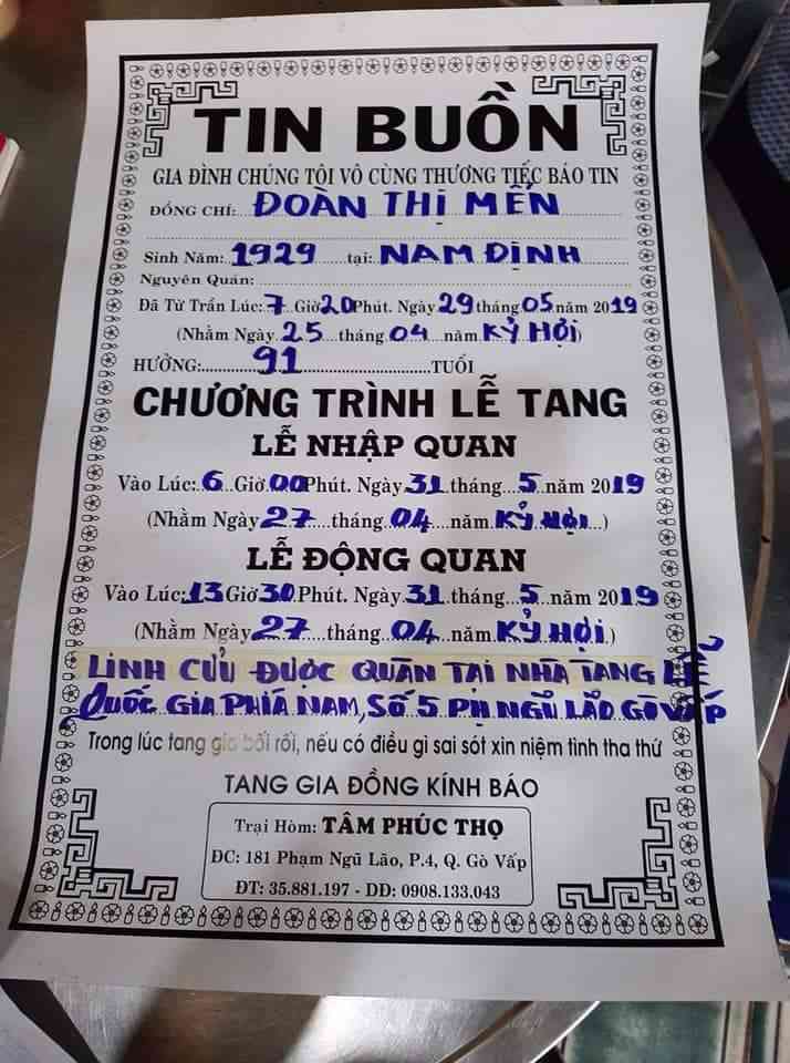 Giờ viếng từ 7h đến 13h sáng thứ 6 31/05 tại nhà tang lễ bộ quốc phòng số 5, phạm ngũ lão, quận gò vấp