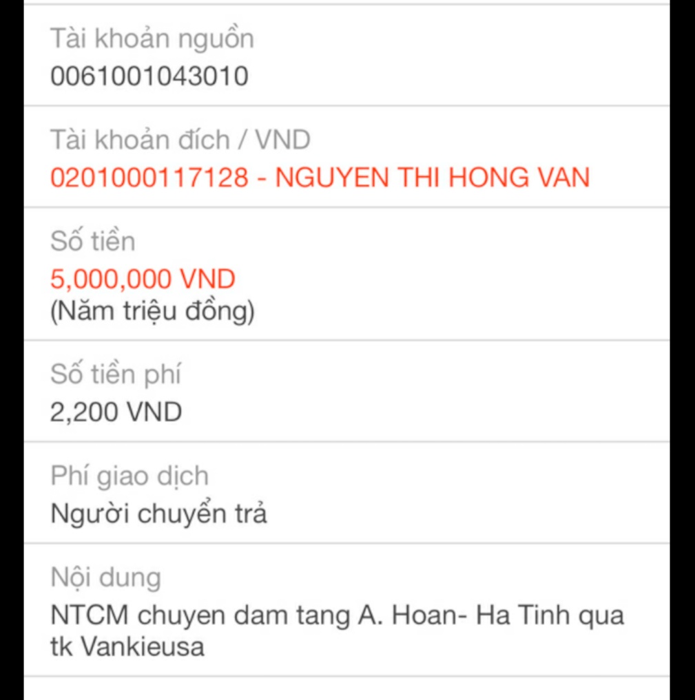 @Thocon : Em chuyển tới Vânkiêusa 5,000,000đ các bạn đã ủng hộ đám tang của anh Hoan dùm nhé.