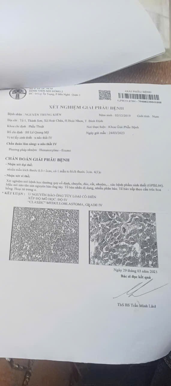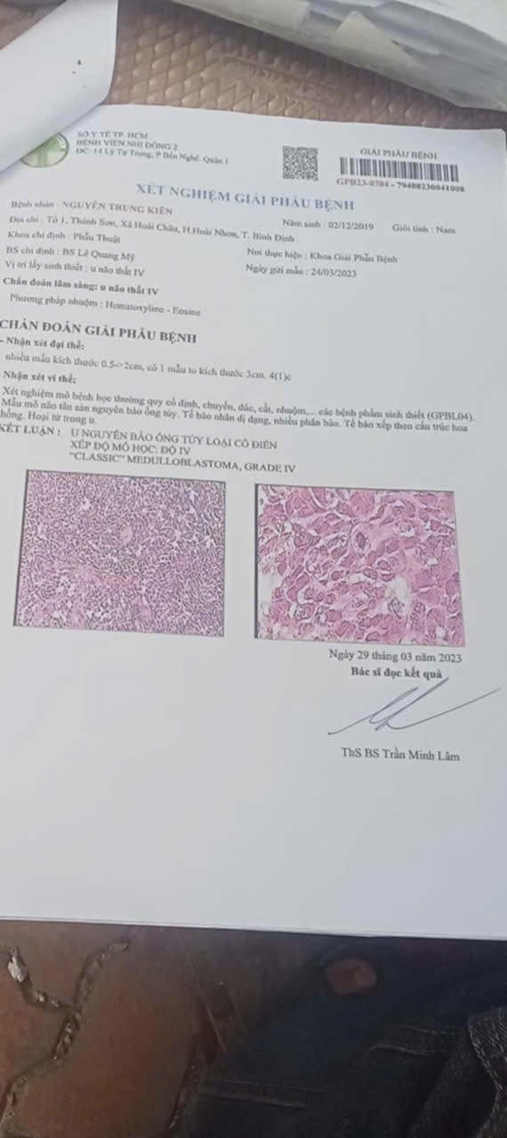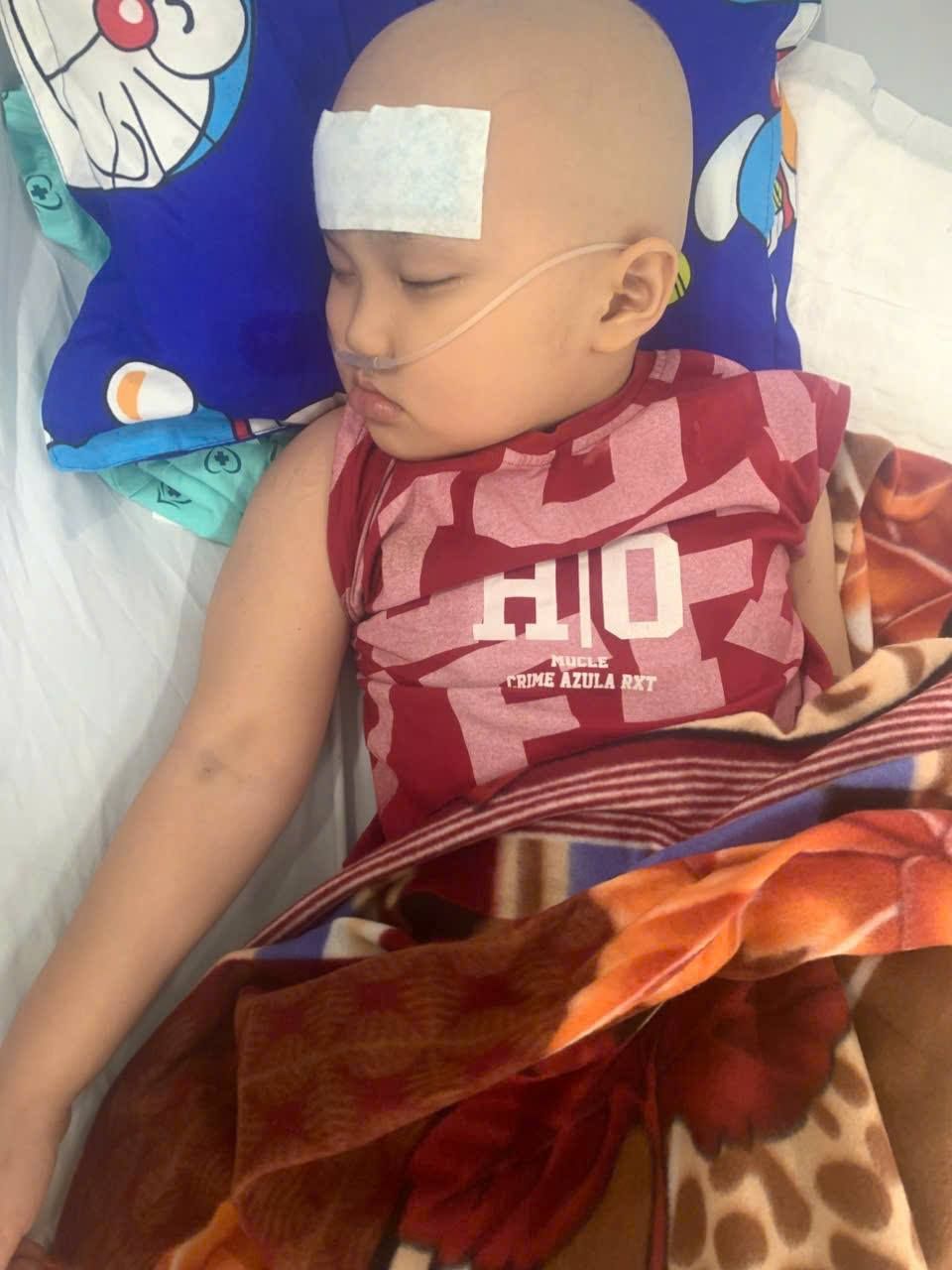Cháu bị phát hiện U ác não thất vào năm 2023. Lúc đó cháu 4 tuổi gia đình đưa vào điều trị và mổ 1 lần tại BV Nhi đồng 2 (Lý Thái Tổ). Sau mổ cháu được chuyển qua BV Ung Bướu xạ trị vừa hết liệu trình vào khoảng 7 tháng trước, tình trạng lúc đấy của cháu cũng tạm thời ổn định, cái khối u lặn đi nhiều. Từ 1 em bé lanh lợi kháu khỉnh cháu trở thành đứa bé xanh xao, đầu rụng hết tóc do xạ trị, cháu không thể đi lại được nữa, chỉ có thể lếch dưới nền nhà, sau xạ trị sức khỏe cháu xuống đi nhiều nhưng cũng tạm ổn định, cháu không nói được chỉ kêu ú ớ và tiếng:  ba mẹ, ăn, uống....