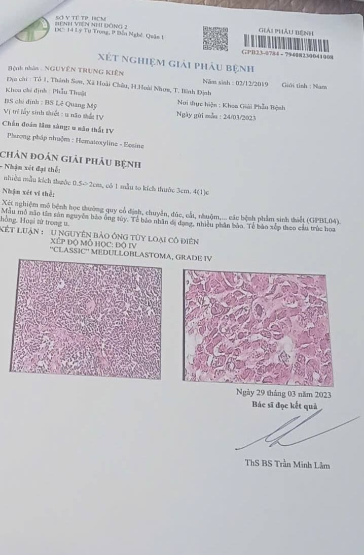 Tuy nhiên, gần đây vào hôm chủ nhật ngày 20/07 khi đang chơi cháu lên cơn co giật, tím tái sùi bọt mép, miệng cứng đờ, khó thở, gia đình lập tức sơ cứu và đưa cháu vào BV Huyện ở Bồng Sơn. Ở BV Bồng Sơn cho chuyển viện lập tức đến BV Đa Khoa Tỉnh Bình Định (cũ). Hiện cháu đang được nằm ở phòng hồi sức tích cực ở đây cũng 3 hôm rồi, tình trạng của cháu thấy càng chuyển biến nặng, bác sĩ báo ở đây không đủ thiết bị máy móc và không có thuốc cho bệnh của cháu, có đề xuất chuyển cháu đi BV Ung Bướu ở Sài Gòn để chuẩn đoán và điều trị nhưng sức khỏe cháu hiện tại yếu đi nhiều, khả năng mất rất cao nếu trung chuyển bằng xe cấp cứu vào Sài Gòn nên hiện tại cho cháu nằm lại để theo dõi.