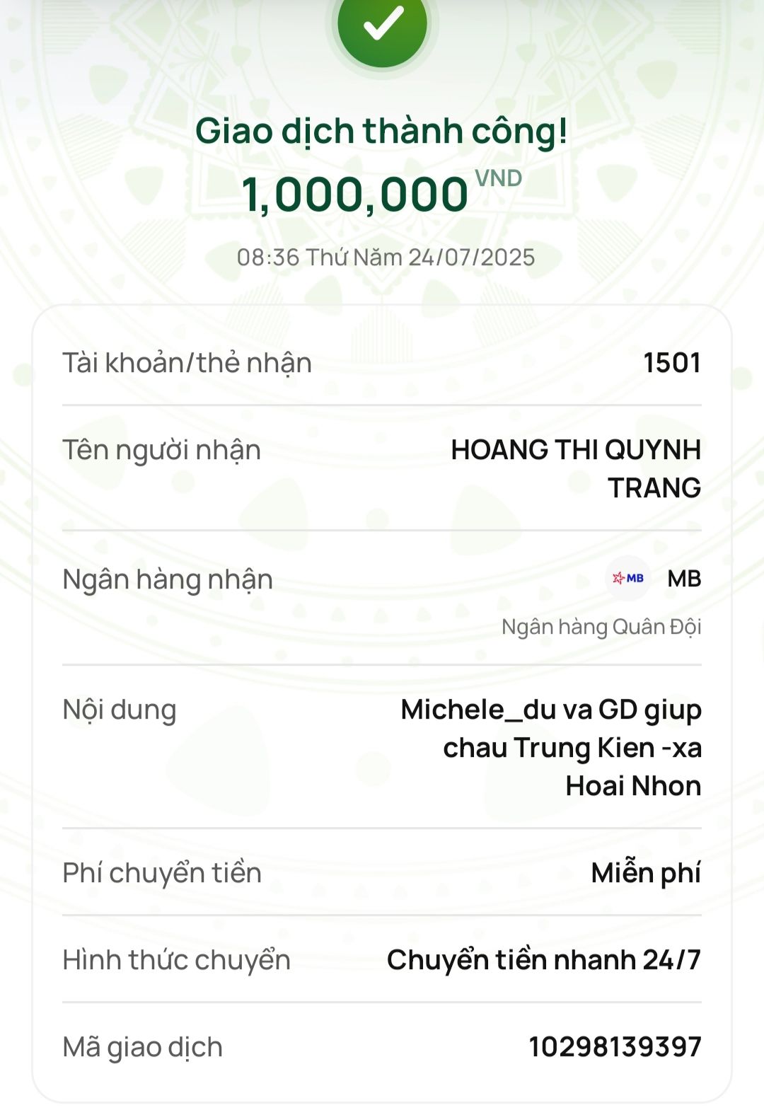Michele_du và Gia đình ủng hộ cháu Trung Kiên 1,000,000₫ - Cầu chúc cháu sớm vượt qua bạo bệnh.