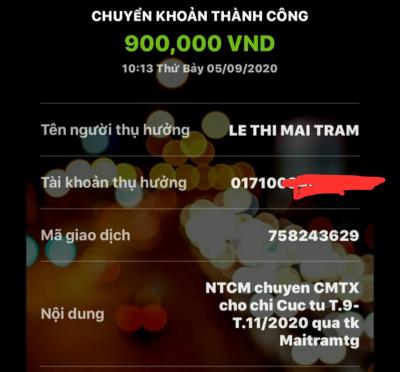 Mai Trâm xác nhận đã nhận được tiền .900.000đ CMTX  đến chị Cúc .