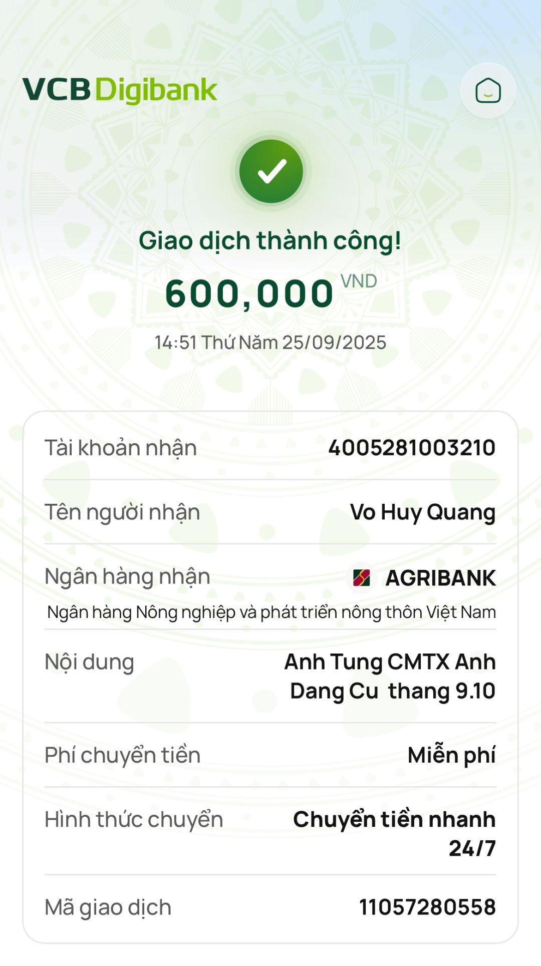 Tieuhuongduong đã chuyển 600.000đ hai tháng 9,10/2025, nhờ bạn trung chuyển giúp nhé.