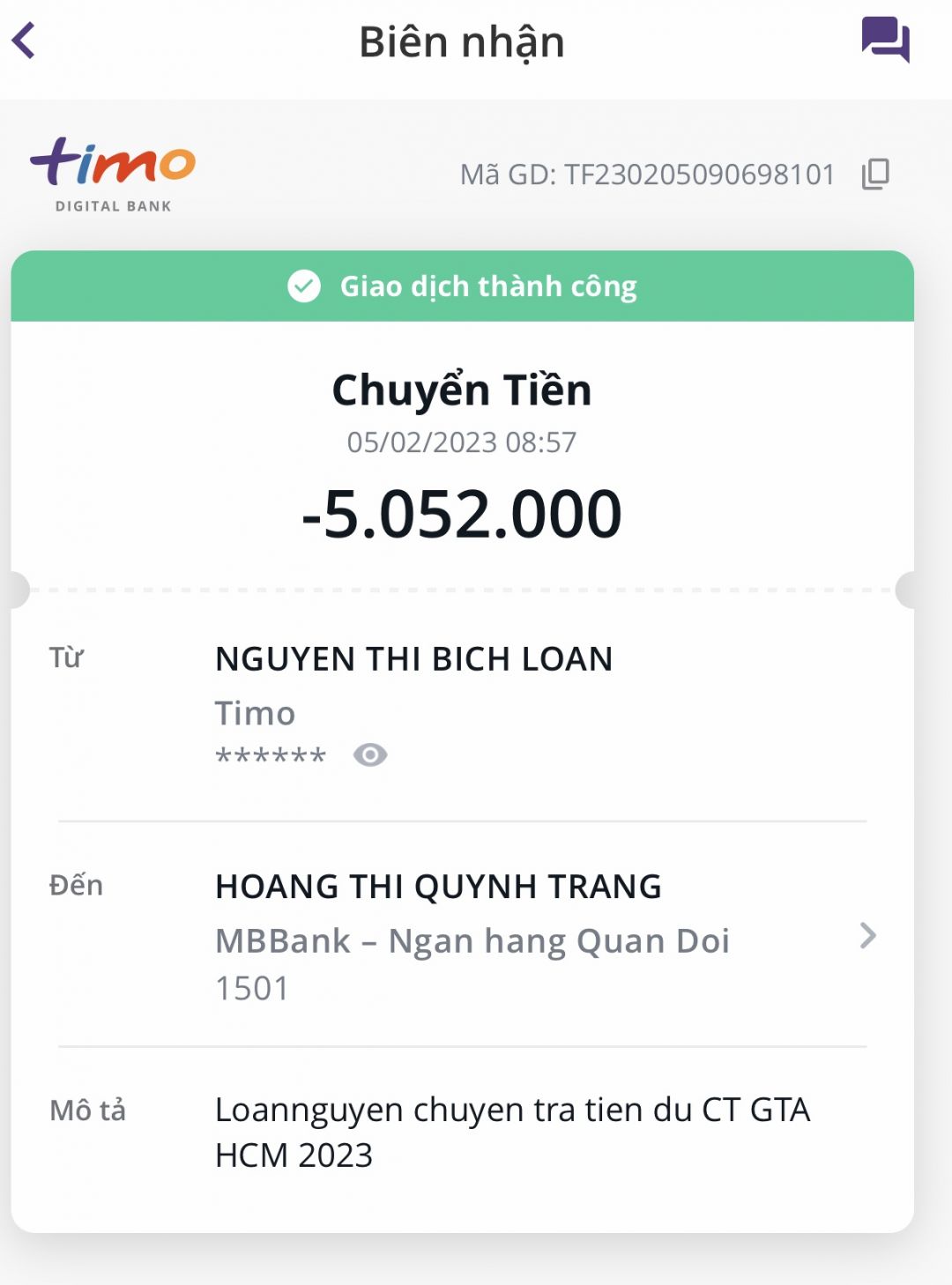 Loannguyen đã chuyển tiền dư của chương trình về tài khoản thủ quỹ rồi ạ.