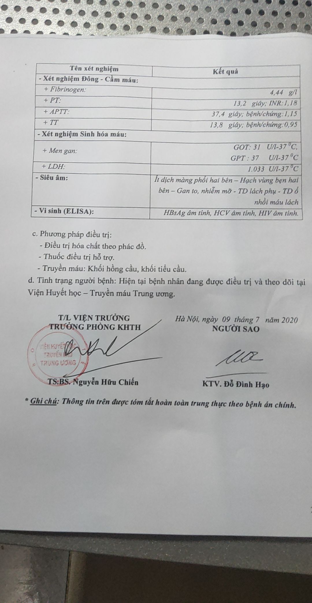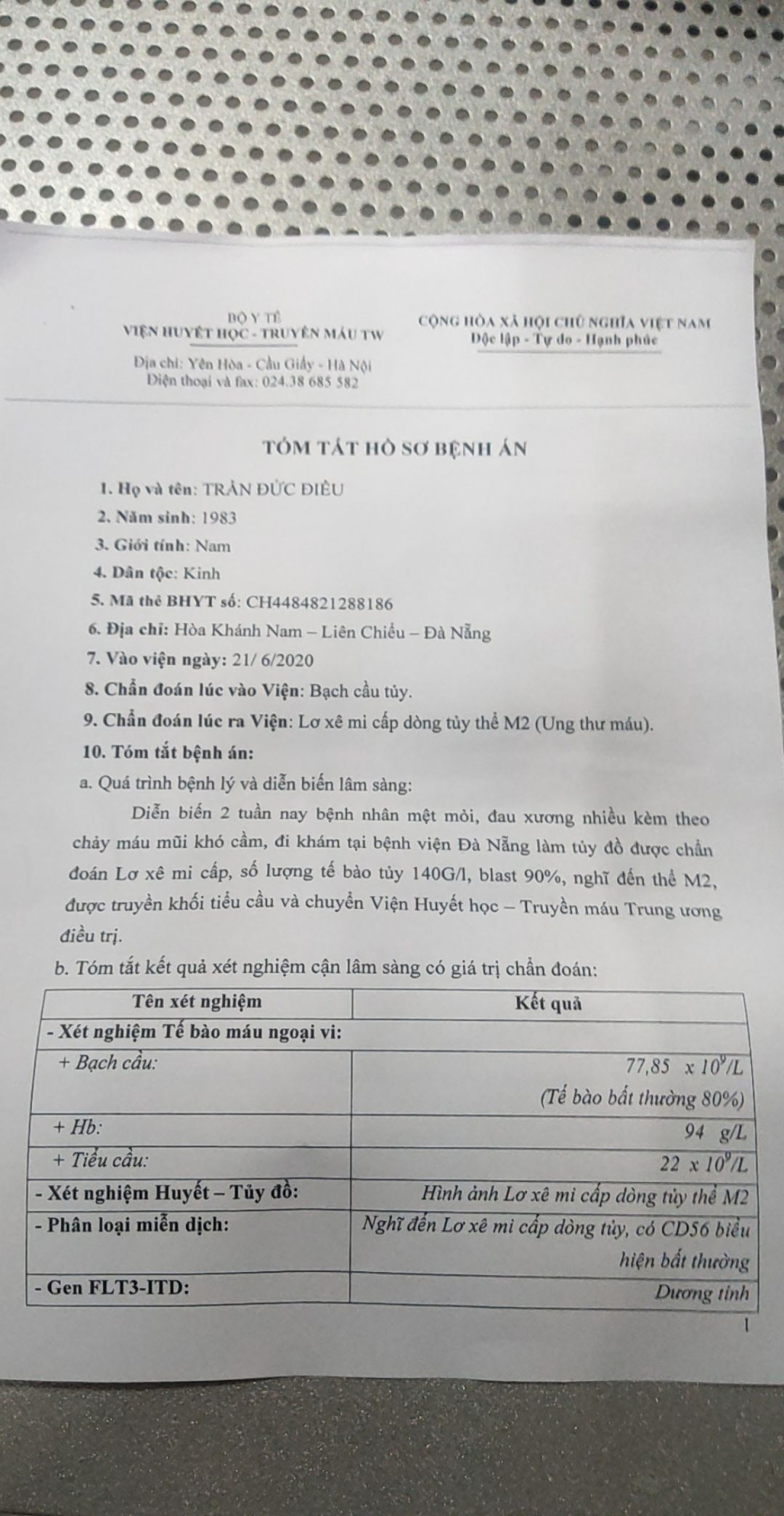 Qua thông tin thì được biết anh Điều - Trần Đức Điều sinh năm 1983, quê tại Trường Minh, Nông Cống, Thanh Hóa. Vợ anh là chị Dung quê Quảng Ngãi. Hai anh chị lấy nhau và hiện tại có 2 bé. Bé Mai con gái lớn anh chị vừa rồi bị tai nạn vẫn phải vít xương chân đi lại khó khăn. Gia đình anh làm việc và thuê trọ tại Liên Chiểu , Đà Nẵng. Anh Điều làm công nhân kỹ thuật với mức lương 9 triệu/ tháng, còn chị Dung làm giáo viên mầm non trường tư thục lương 5 triệu 1 tháng. Anh Điều được chuẩn đoán mắc " Lơ xê mi cấp dòng thủy thể M2" tức ung thư máu. Do từ khi mắc bệnh anh nằm viện chị chăm anh nên không có thu nhập từ công việc, gia đình con cái chuyển về sống tại nhà nội ở xã Trường Minh, Nông Cống, Thanh Hóa ( không ở Đà Nẵng nữa) .Bố mẹ anh Điều có 4 người con, anh Điều là con út, các anh chị đều làm ruộng tại địa phương,( không được địa phương công nhận hộ nghèo hoặc cận nghèo). Hiện tại anh Điều đang điều trị tại viện huyết học truyền máu TW được chi trả bằng bảo hiểm y tế tự nguyện ( 80%). Mỗi lần ra Hà Nội điều trị tại viện huyết học ( khoảng 20 ngày điều trị ) sau khi được giảm trừ bảo hiểm y tế thì gia đình chi trả khoảng 40 triệu đồng. Hiện tại anh đang nằm tại giường 91 phòng 720 tầng 7 viện huyết học và truyền máu TW. Dưới đây là hình ảnh và hồ sơ bệnh án của anh Điều ( vợ anh cung cấp). Do chưa xác minh trực tiếp, vậy nhờ chị Mai Tân và các thành viên nồi soup Hồng thêm giọt máu trưa thứ 7 tuần này đi phát cơm qua xác minh trực tiếp phía bệnh nhân cũng như phía bệnh viện cũng như nhờ các thành viên NTCM Thanh Hóa xác nhận tại quê của anh Điều tại xã Trường Minh, Huyện Nông Cống, Thanh Hóa để có thêm thông tin hơn.