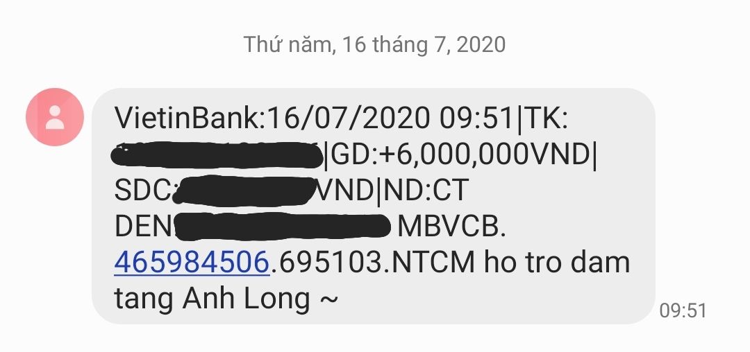 : Em chuyển tới Tran Ha 6,000,000đ tiền hỗ trợ đám tang anh Long dùm nhé.