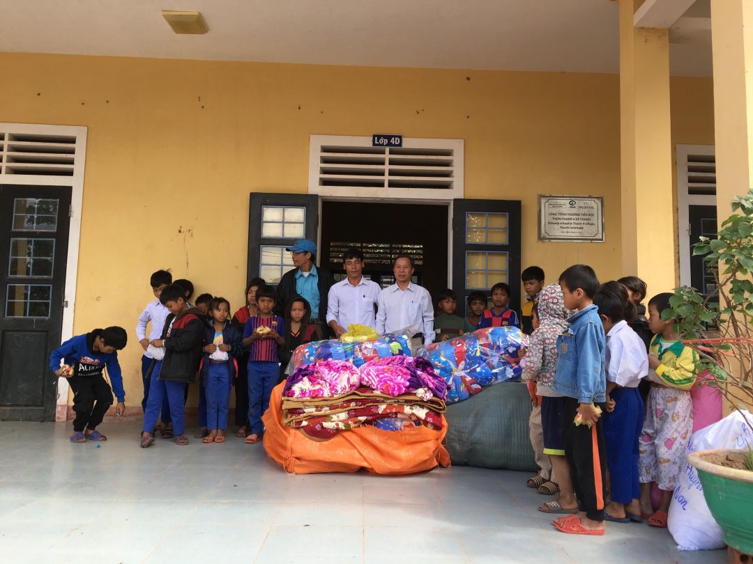 Nhóm 4: Trao quà hỗ trợ bán trú cho 80 e HS tại điểm trường Thanh 4 củaTrường Tiểu học Thanh (gối, chăn, thảm, muỗng/thìa) và áo quần, chăn gối, ly uống nước, mũ dép cũ.