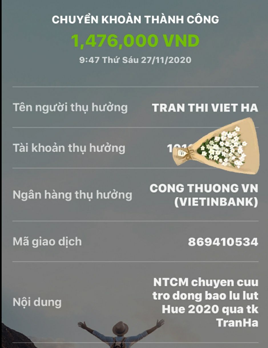 Garage Sale đã chuyển 6,929,000 VND tiền bán hàng gây quỹ để Ủng hộ khắc phục bão lũ Miền Trung - dành cho Huế.