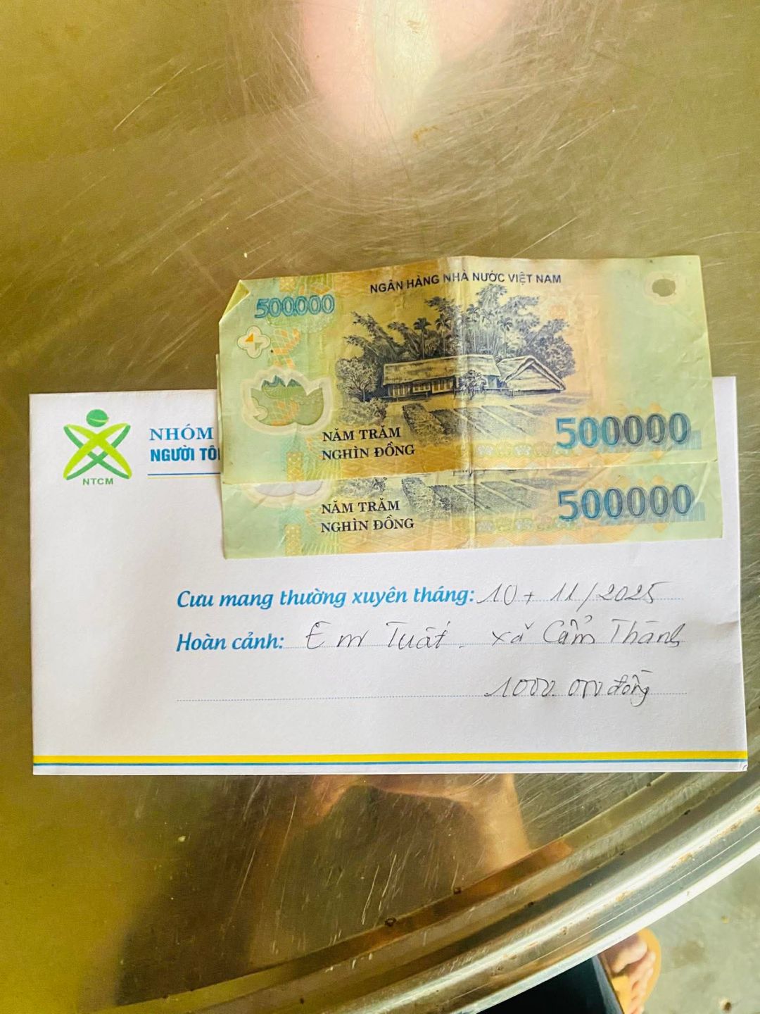 Chào cả nhà !Chúng ta còn sót khoản tiền CMKTX của bác @kimbang từ năm 2022 tới giờ chưa trao... trong khi hàng tháng vẫn có thành viên ghé thăm và trao tiền CMTX. Rất xin lỗi vì việc bỏ sót này.@trangvitgioi : Em xuất chuyển 1,000,000₫ của bác @kimbang tới mẹ con chị Tuất dùm nhé.Xin cảm ơn sự quan tâm của cả nhà Thân mến.