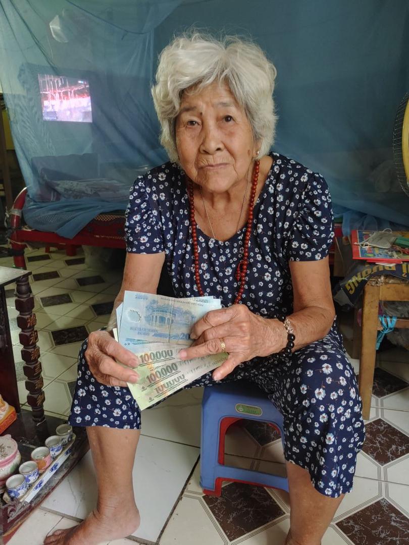 Letuantu cập nhật hình ảnh trao tiền tháng 6 + tháng 7 cho bà hai Kim. Tổng là 400,000đ/tháng, bao gồm 100,000đ từ Mộc Di và 300,000đ từ Biển Đêm.