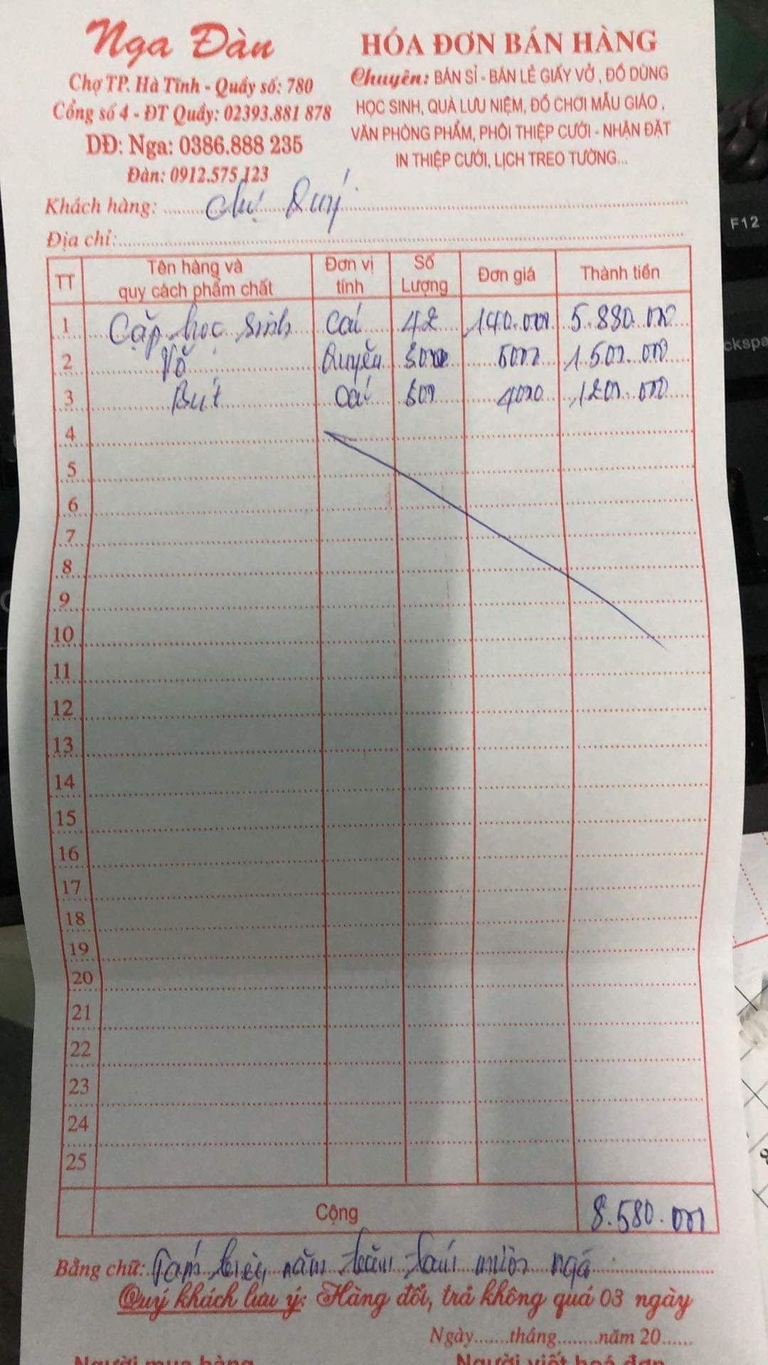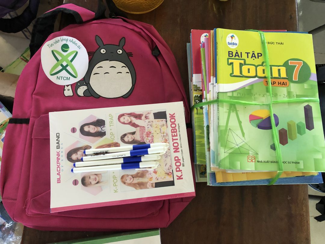 Tổng kinh phí mua cặp, vở, bút là: 8,580,000₫