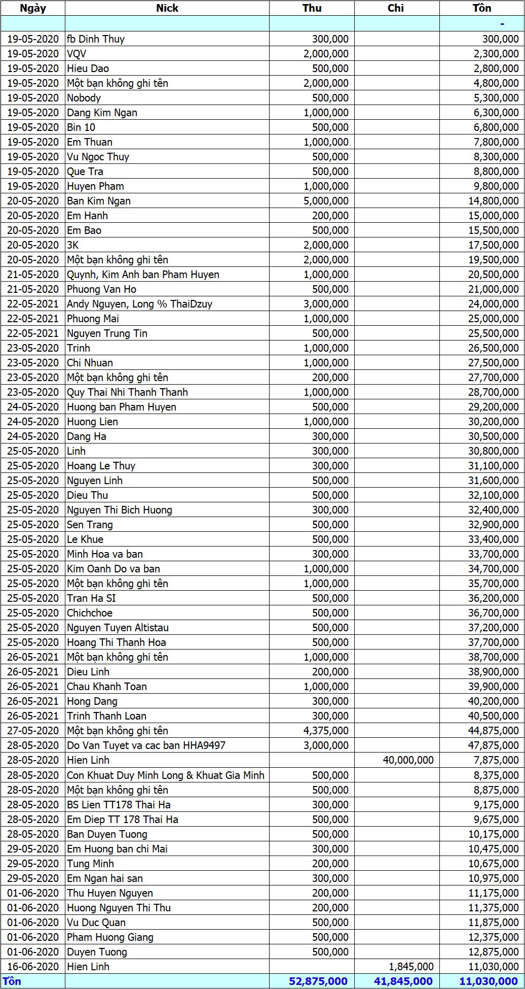 Em đã thực hiện đối chiếu lại sao kê chuyển khoản , bảng thống kê của cán bộ làm chương trình (mai tân) và thống kê của thủ quỹ (Trang vịt giời) . Tra soát lại sao kê tháng 5 và tháng 6/2020.  Mai tân xin giải trình sự chênh lệch như sau (phần bôi màu cam)