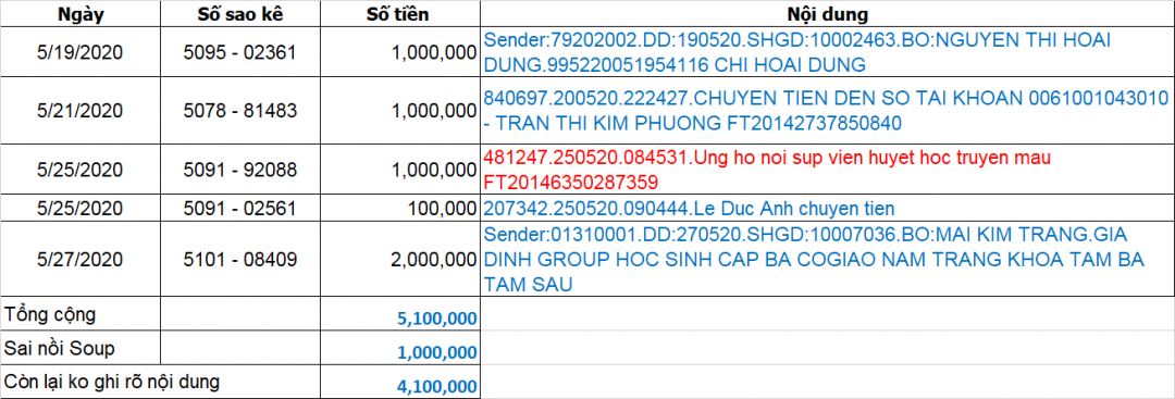 File hình là chi tiết sao kê tổng 5.100.000đ, trong đó thống kê nhầm 1.000.000đ của một bạn ủng hộ nồi Soup huyết học => Còn lại 4.100.000đ là 4 giao dịch không ghi rõ nội dung, các bạn cũng không có bài viết đăng ký ủng hộ trên diễn đàn nên quỹ không thể nào đối chiếu được. Song chị Maitan đã thống kê và xác nhận thời điểm diễn ra của chương trình thì quỹ sẽ ghi nhận theo thống kê của chị Maitan.