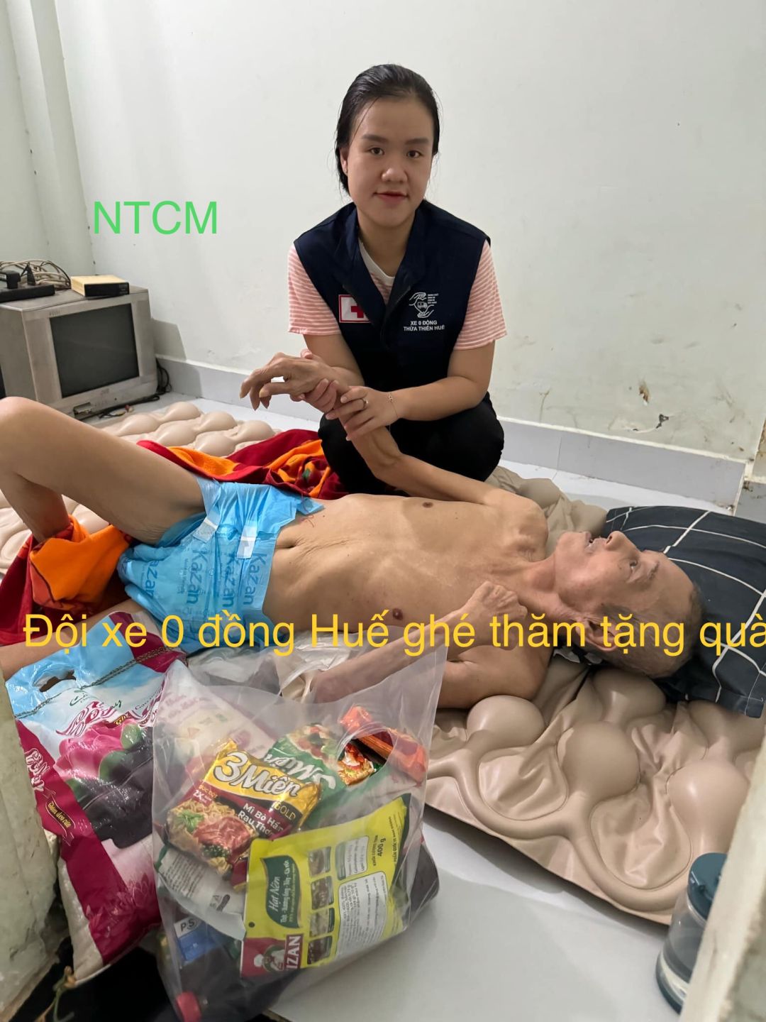 Đội xe 0 đồng Huế tặng ông ít gạo, mì tôm và túi gia vị.