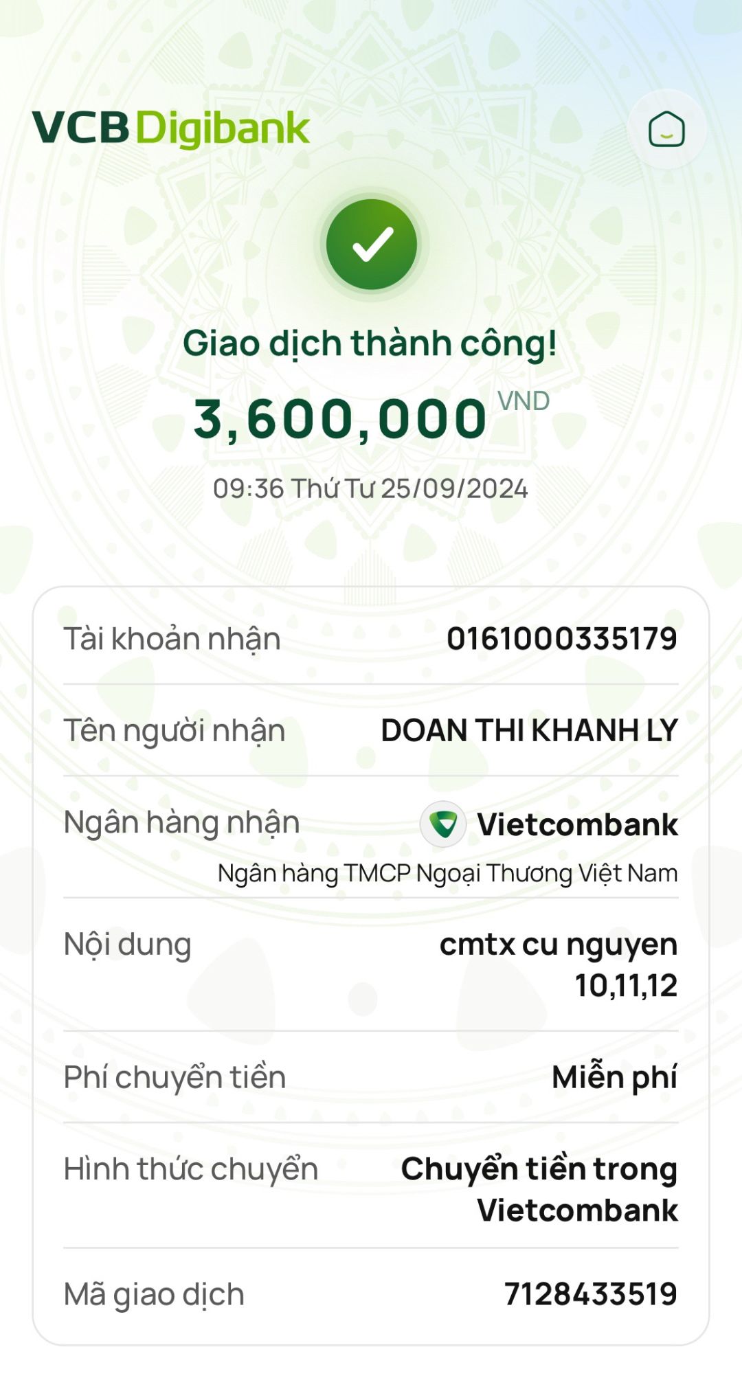 Khánh Ly đã nhận số tiền 3.600k từ bạn Minh Nhật.